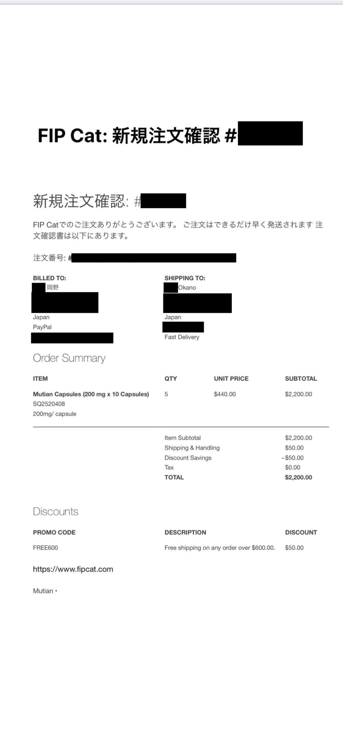 FIP混合タイプと診断され、投薬量を1.5倍の500mlに変更となり、追加輸入していたMUTIANが到着しましたので、ご報告させて頂きます。