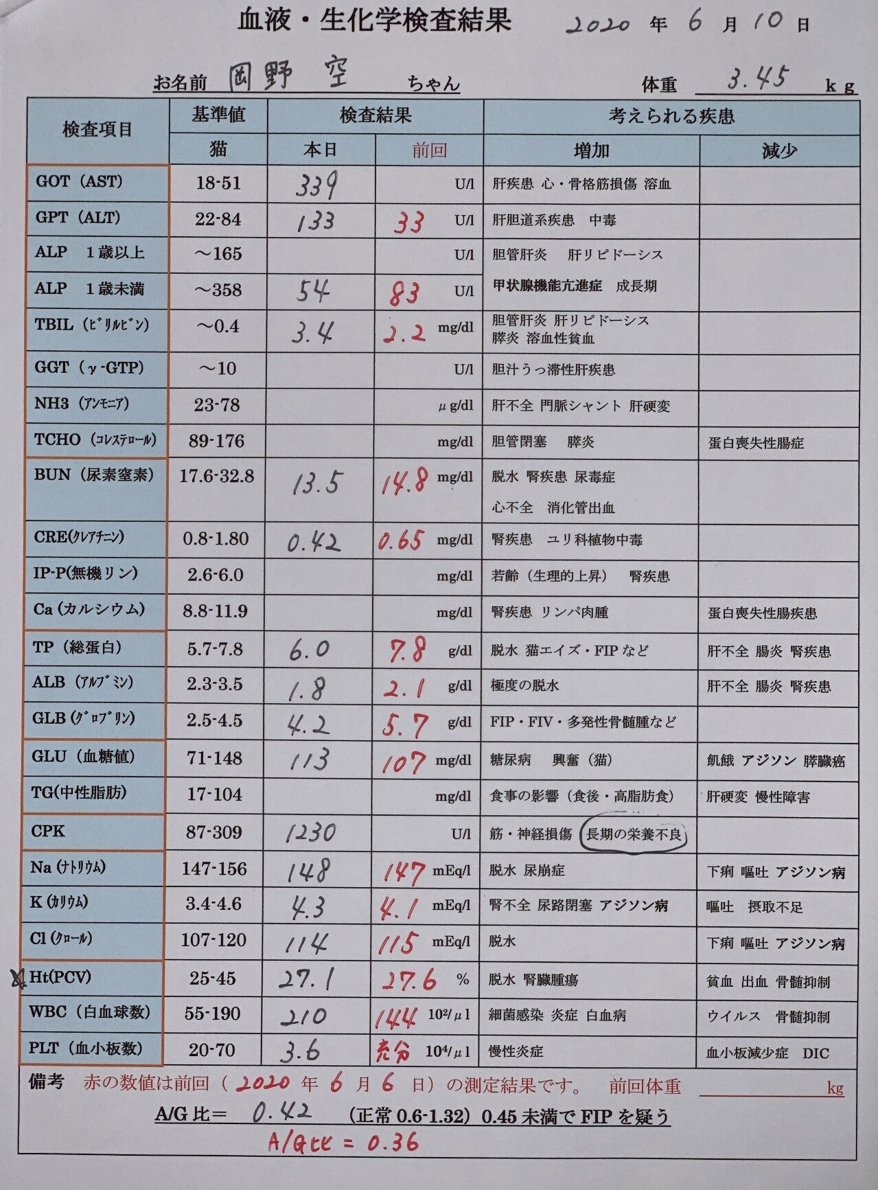 また、1週目の検査でFIPの最も重要な目安となり貧血の値を示すHt(PCV)の値がかなり減少しており、長期の栄養不良状態と診断され、貧血を改善するための治療も開始しました。