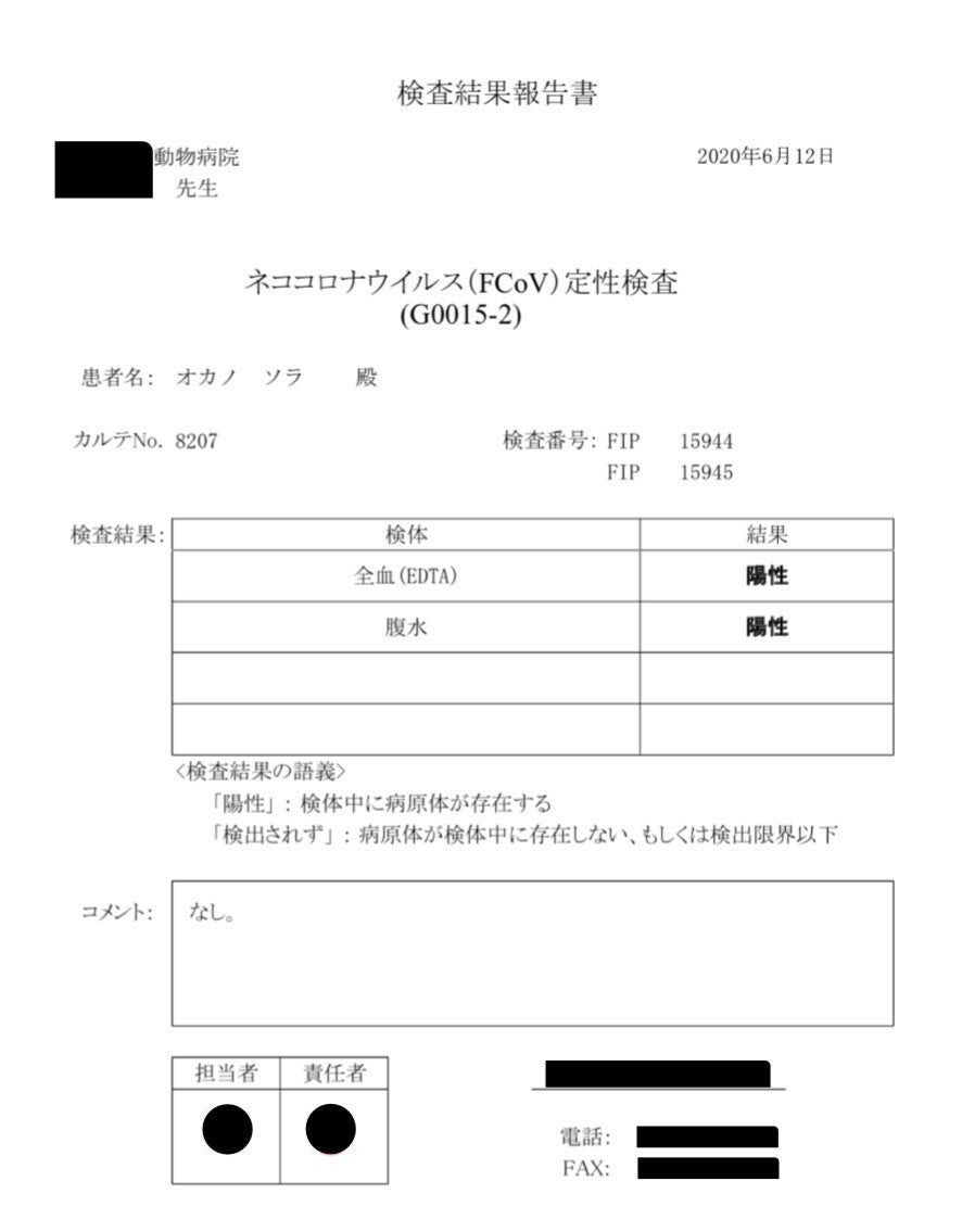 獣医師より「FIPの可能性が極めて高く、非常に難しい病気で、死亡率は100%、何もしなければ1~2週間の余命です。」と診断を受け、「対処療法(解熱剤、整腸剤等)で少しでも楽にしてあげることしかできない。」と言われ、目の前が真っ暗になりました。