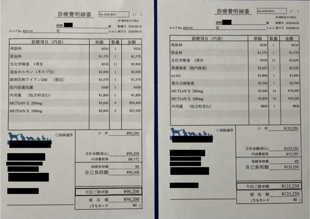 主に「MUTIAN」の購入費、動物病院での診察や検査代、その他必要となった費用等です。