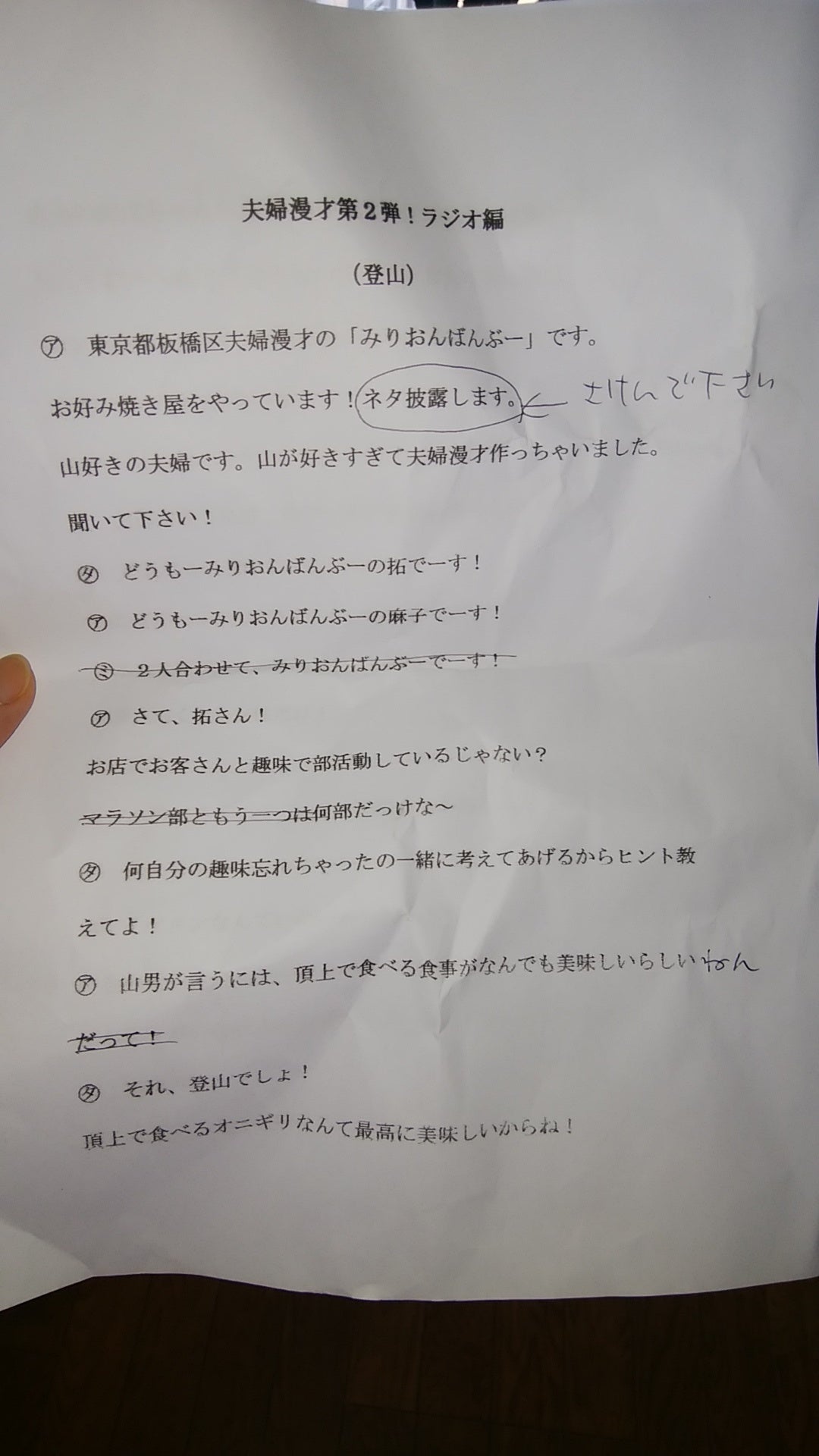 夫婦漫才として、山の日に向けて書き下ろした3分位の登山ネタを、