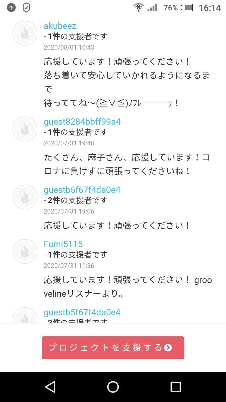 ご支援ありがとうございます。私達もクラウドファンディングが始めてなので、分からない事ばかりなんですが、ご支援頂いた方に、具体的な内容のお礼がしたいのですが、上の様にどなたが、ご支援して頂いたのか、分かりません。プロジェクトが終了したら分かる様です。具体的なお礼が出来なくて申し訳ありません。