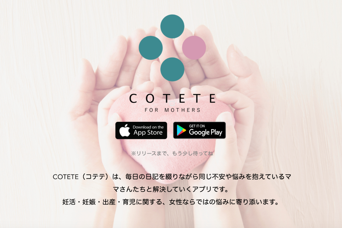 妊活中・妊娠中は、ホルモンバランスの影響や様々な不安や悩みによって、精神的に不安定になりがちです。 また、それを打ち明ける場所や相談相手がいないと精神的にも落ち込んでしまいます。 誰でもママになるのは初めてのこと。 不安や悩みがあって当然のはず。でもそれを解決する場所がオンライン上では中々ありません。 COTETE(コテテ)では、妊活から出産・育児まで初めてのママさん達が安心して悩みや不安を打ち解けられ、相談できるような場所を作って行きます。