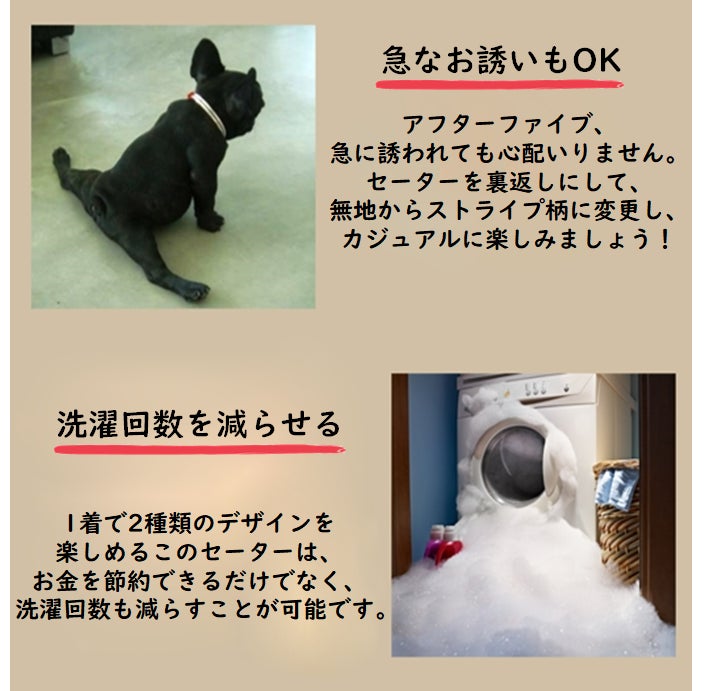 2020/08/06 18:00APZC社が制作するこちらのリバーシブルセーター、文字通りリバーシブルなので、無地とボーダーのデザインがすぐに変更できます。その日の気分や場所に合わせて、クルッとデザインを変更してみてくださいね!ご質問等ありましたら、お気軽にお問い合わせくださいませ。NinJapan Agency もっと見る