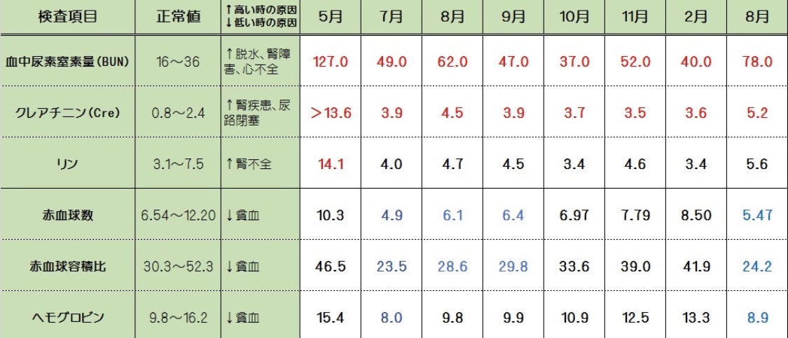 2020/07/08 10:00赤・・・高すぎる異常値青・・・低すぎる異常値慢性腎不全が進行していて、赤血球数が減っていて腎性貧血にもなっていました。獣医さんによると「腎不全を治す薬は十数年経っても出来ない思います。ただ歳のせいもあり慢性腎不全は完治はできるかわからないが、病気の進行を遅らせる事は可能です。そのために、とにかく食べて体重を戻す事。輸液をして脱水症状を緩和し、ストレスをかけないようにすることが大事です。食事に関しても私は(強制給餌は別として)自分で食べられるものなら、腎不全用のフードでなくても食べさせた方がいいと思っています」「輸液は毎日100mlしているので、無理やりに水を飲ませると言うことはしなくて大丈夫です」とのことでした。これらは2018年から2019年の時の検査結果です もっと見る