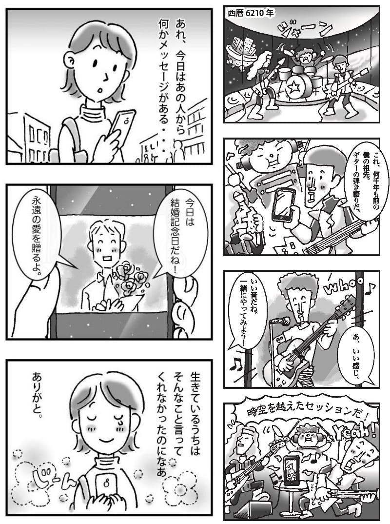A. 会員制のサロン、もしくは「とこしえ霊園」のようなものがあったとします。自分の死後、「とこしえ」を納め、会員は故人の「とこしえ」を閲覧できます。人の数だけドラマがあると言いますが、ひとつひとつの「とこしえ」を閲覧すれば、その人の人生の喜びや悲哀にも触れられ、下手なエンターテインメントを凌ぐ興味深さでしょう。数百年前のあの人に「ほの字」だなんて、ロマンティックです。