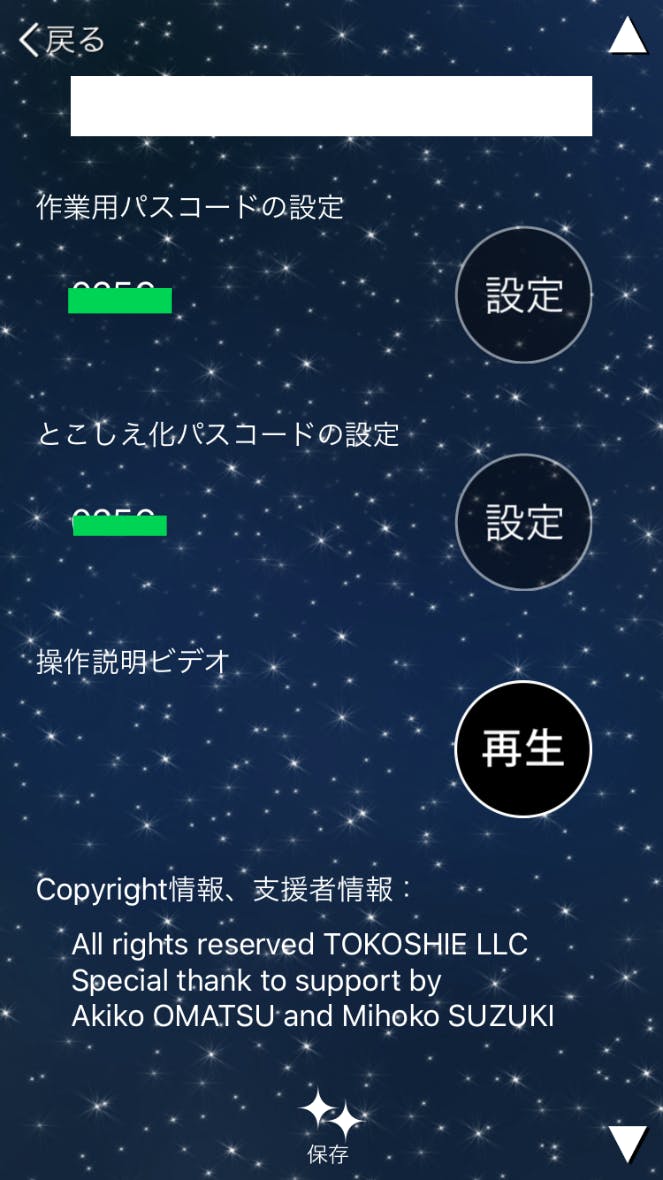 あなたの死後、託された人があなたの命日を入力し、「とこしえ」を本番動作させ、文字通り永遠化させます。まるであなたからいのちをバトンタッチされたように、あなたを現世や未来につなげてくれます。「とこしえ」の始まりのセレモニーです。「とこしえ化」した後は一切のデータの追加、修正ができません。あなたの歴史は永遠に改ざんされません。「とこしえ化」後はオフラインで動きます。