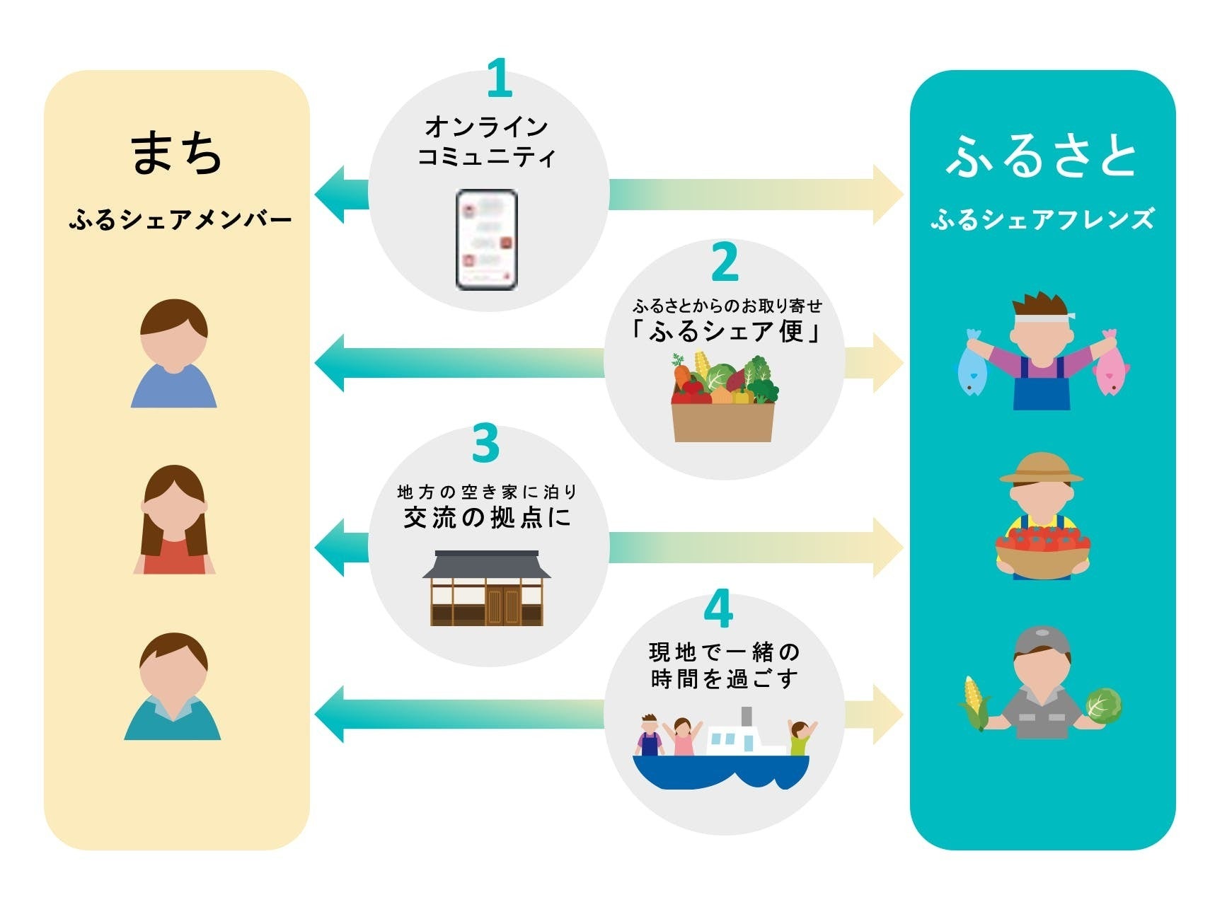 「ふるシェア」は「まち」の人と「ふるさと」の人との交流をアシストする会員制のプラットフォームです。一棟貸別荘「ふるシェアの家」の他にオンラインコミュニティを通じて「ふるさと」の人と「まち」の人が一緒の「モノ」「コト」「時間」を共有して友達になることを目指します。【ふるシェアで出来ること!】⑴オンラインコミュニティに参加⑵オンライン&オフラインの交流イベント⑶ふるシェア便⑷ふるシェアの家に宿泊メインとなるサービスは「ふるさと」の古民家を改装した一棟貸別荘「ふるシェアの家」です。高級ホテルや旅館のように立派な施設ではありませんが、まるで実家や親戚の家にいるように過ごせる場とし、「ふるさと」の人と交流の拠点となります。また、「ふるシェア便」は、交流を深めるツールとして「ふるさと」の美味しいもの、「まち」の美味しいものなどを互いに送り合うことが出来ます!「ふるシェア」が目指すのは日本中の関係人口になること。 国に自分の「ふるさと」と呼べる場所を作り、関係人口の増加を通して、高齢化や人不足などの地域の課題の解決を目指したいと考えています。「旅行以上、移住未満で日本中の関係人口になる」これが「ふるシェア」の目指す未来です。「ふるさと」の漁師さんと一緒に釣りをするなどのアクティビティや人手が足りない農作業やお祭りを手伝うなど、ふるさとの暮らしと営みに入らせていただきながら、「まち」と「ふるさと」それぞれのお困りごとをみんなで解決し、助け合いが自然に生まれる時間。そんな世界観を広めることを目指します!!皆さま、ご支援よろしくお願い申し上げます。