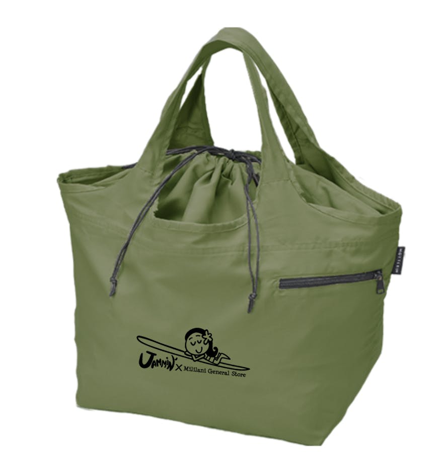 マルシェバック: 本体600×300×240/容量約25L/プリントサイズ約W240×100 ゴムバンドでクルリと纏めて持ち運びができます。レジ篭サイズの大容量なので旅行やランドリーバッグとしても幅広くお使い頂けます。