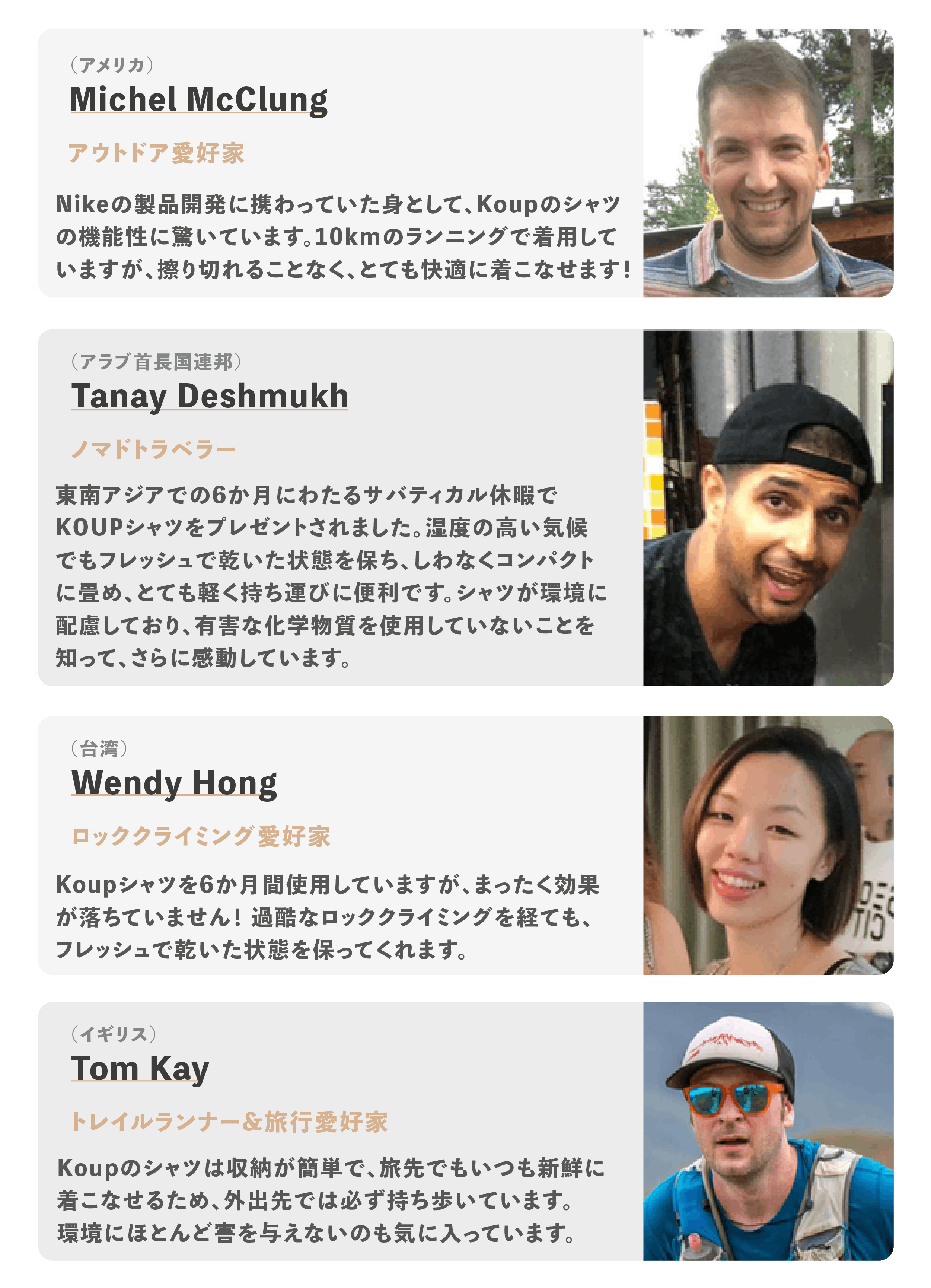 当社は有害な化学物質や重金属を使わず、世界中で愛されるスパイスを原料にTシャツを作り続けています。KOUP Tシャツはぴったりと身に付き、防臭効果が施され、速乾性で非常に軽量に作られています。フレッシュで快適な着心地がいつでも得られます!