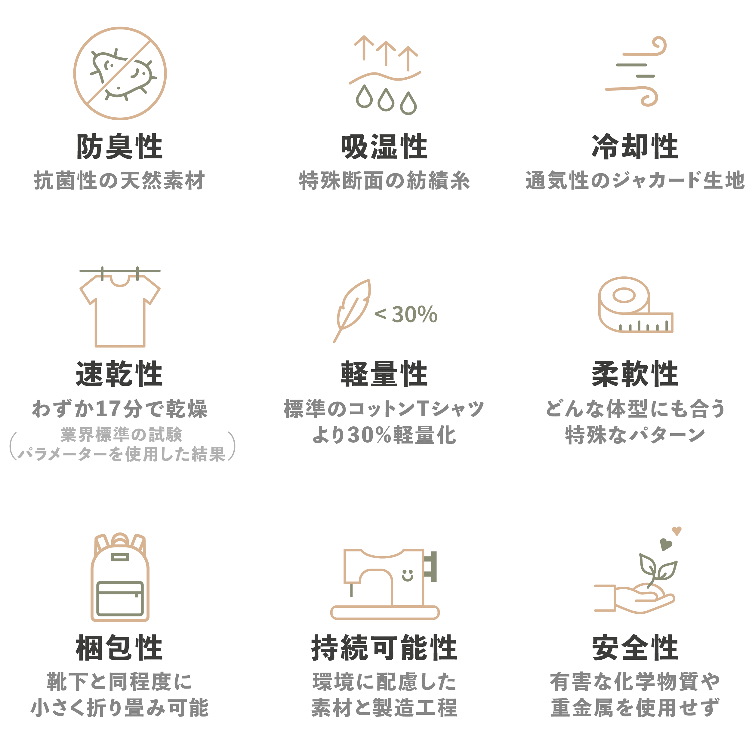 KoupのシナモンTシャツはテクスチャ加工を施されたジャカード構造(生地に多くの気孔が存在します)を採用しており、生地を通じて空気や汗が自由に移動できます。このため、体温が生地を通じて外気へ放散され、心地よくTシャツを着ていられます。
