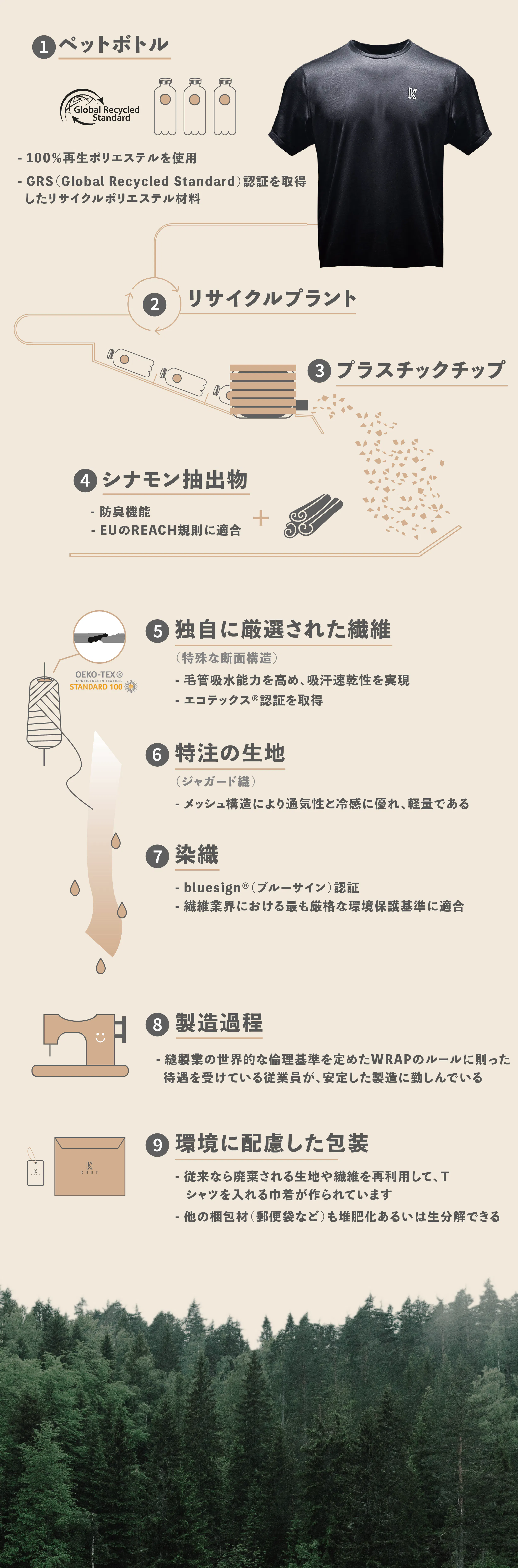 KoupのシナモンTシャツは有害な化学物質を一切使用せず(REACH & OEKO-TEX準拠)、リサイクル素材(グローバルリサイクル基準で認定された紡績糸メーカー)を採用しています。ブルーサイン認証を受けた染料ミルを使用して生地を着色しており、衣料工場は世界規模の責任ある認定生産(WRAP)の認証を受けています。当社の製品を真に環境に配慮させるため、持続可能性に関して業界で最も厳しいテストを経たメーカーのみから素材を仕入れています。