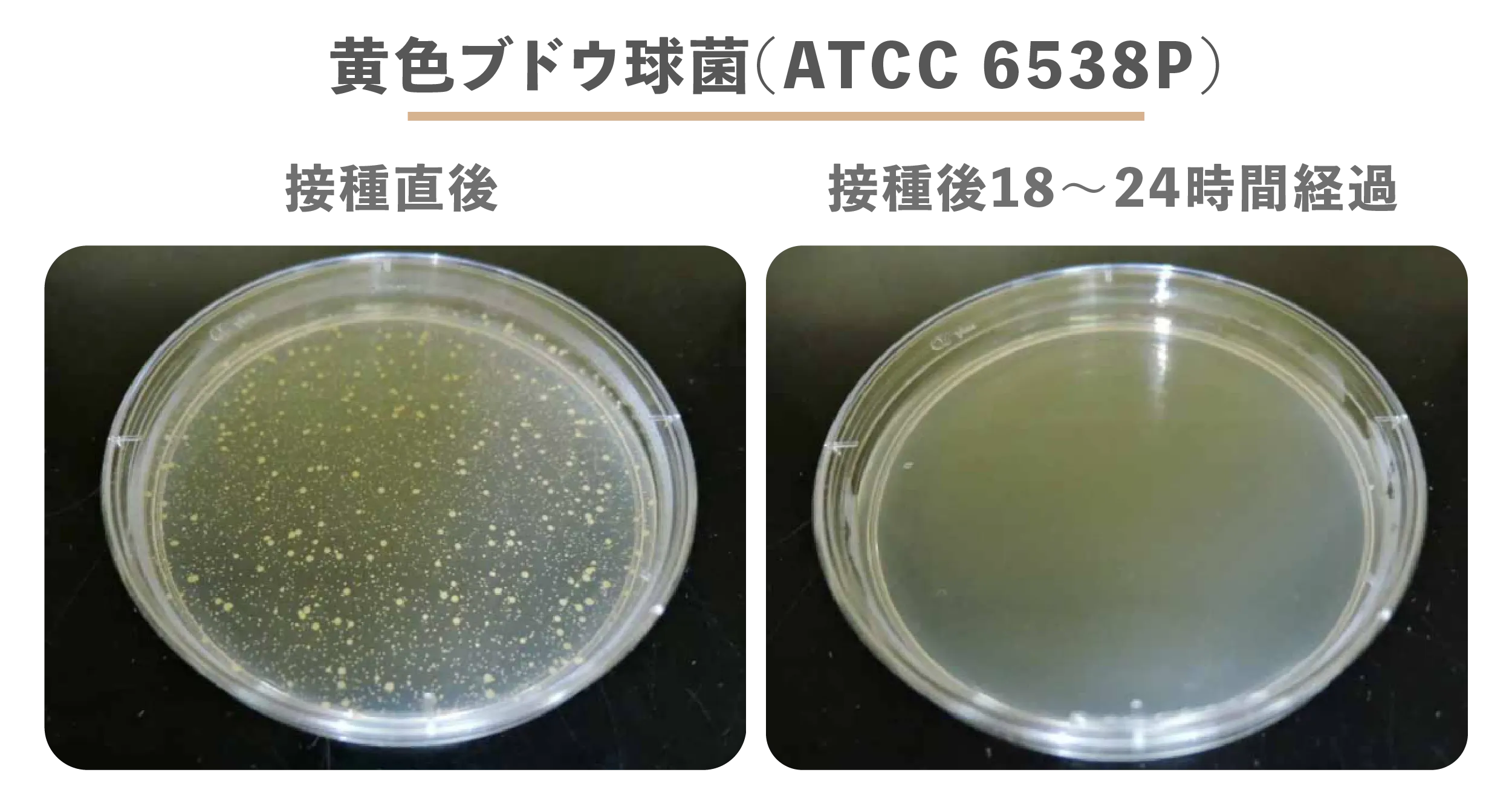 左側の写真は、バクテリアがペトリ皿へ投入された直後の様子を示します。ご覧いただけるように、白い斑点はバクテリアです!シナモン生地と接触して18~24時間後、ほぼすべてのバクテリアが生地の表面から除去されています。シナモンTシャツでは臭いを発生するバクテリアが成長できないため、汗をかいたあとのやっかいな臭いが消え、いつでもフレッシュな感じを保てます。