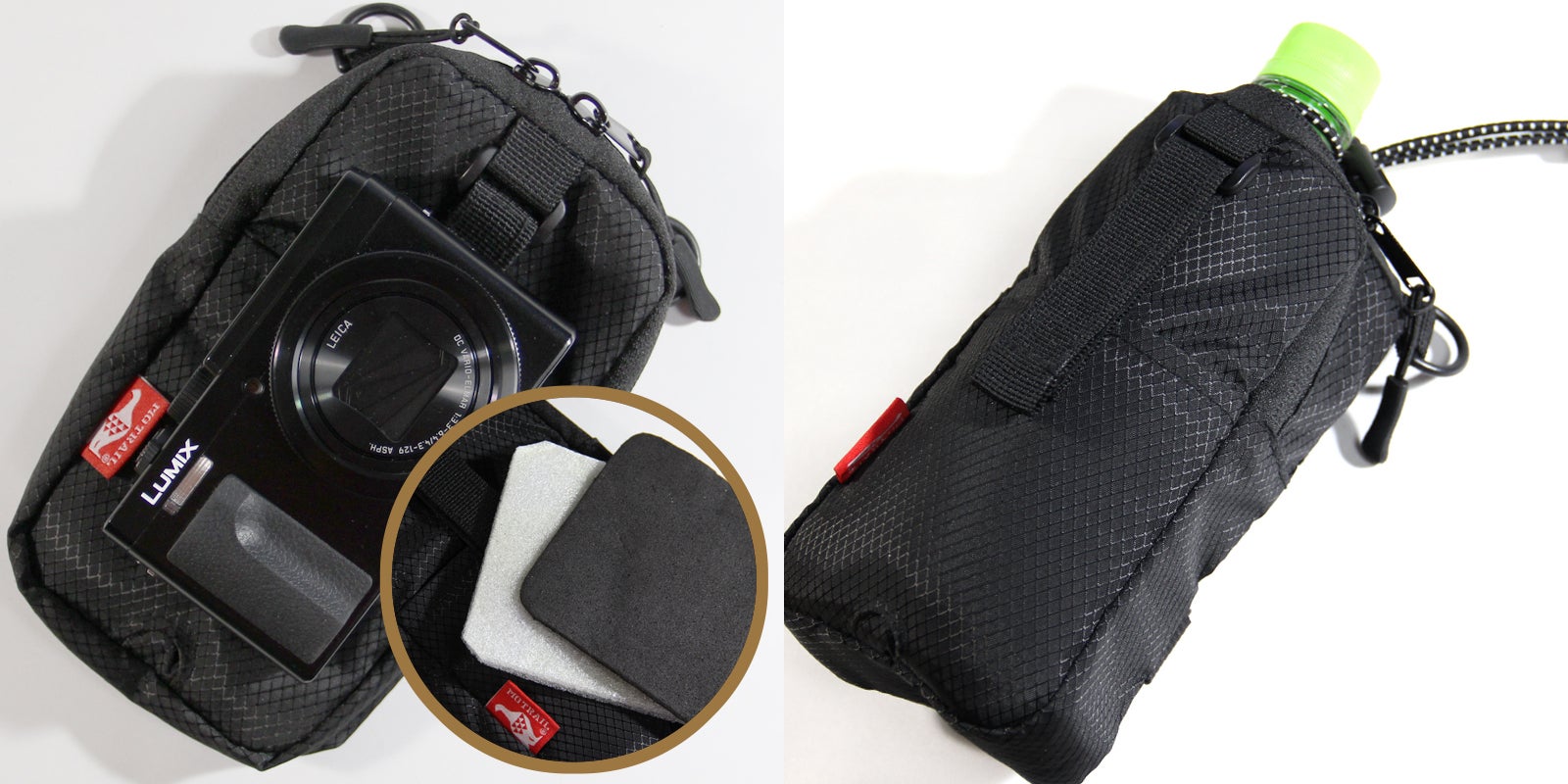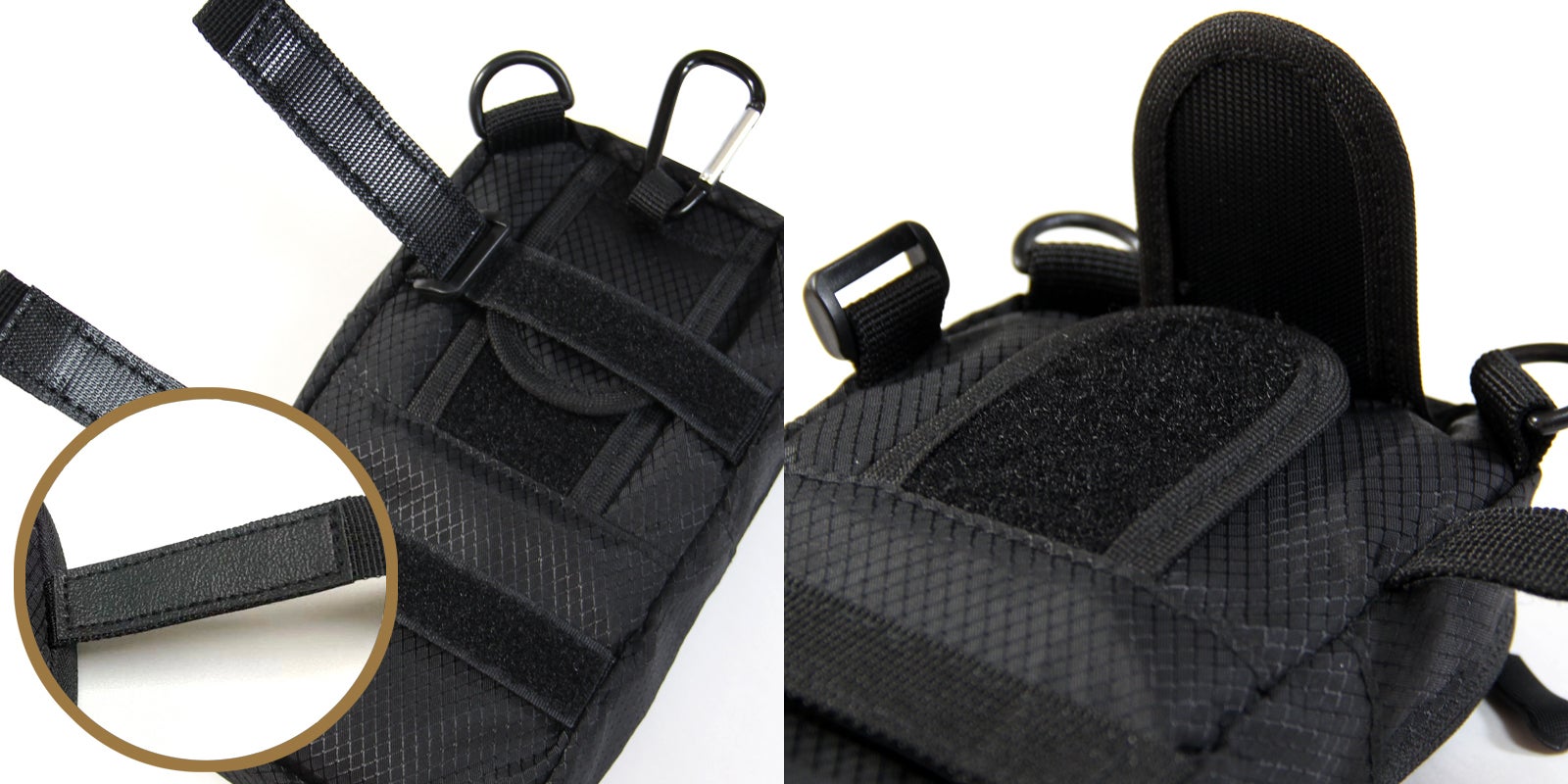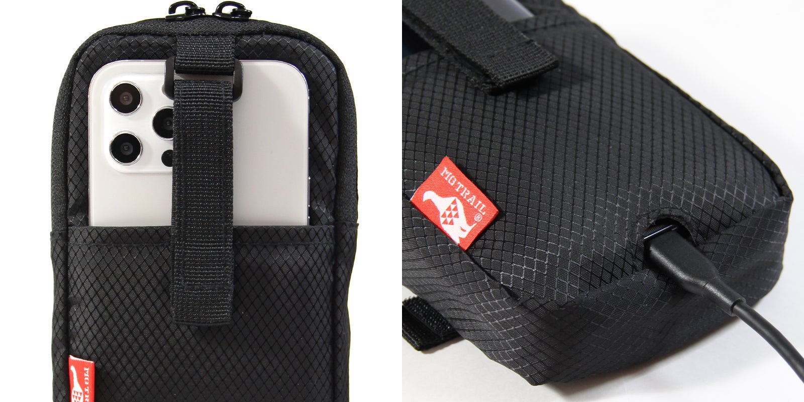 前面にスマートフォンのホルダーポケットを配置。マジックテープでしっかり固定できるので、ドラレコや動画撮影での行程記録に活用できます。ポケット内側にズレ防止の滑り止めを貼ってあります。※スマートフォンの種類によってはレンズの配置が違うためベルトが干渉してしまいます。