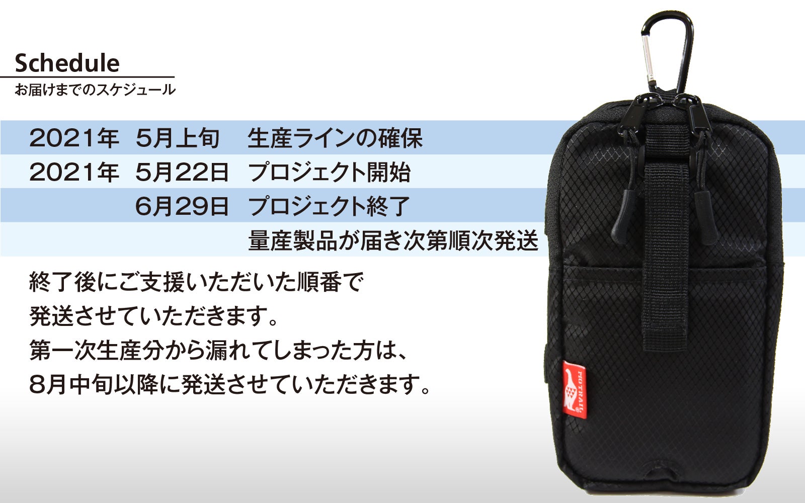 2021/07/01 06:27今まで多くの方からのご支援いただき本当にありがとうございました!無事にフリースタイルアウトドアポーチののプロジェクトを終えることができました。目標金額を達成でき、多くの方から応援のメールをいただき感謝しております!ポーチは初回生産分がすでに入荷しており、検品梱包を行っておりますので順次発送させていただきますね。プロジェクト後半の第二次生産分をご支援いただいた方は、現在生産を行っておりますのでしばらくお待ちください。今回のフリースタイルアウトドアポーチのプロジェクトでは皆様のおかげでとても強い手応えを感じることができました。また新しいプロジェクトを近日発表予定ですので皆様にお会いできるのを楽しみにしておりますね(^^今回のご支援本当にありがとうございました! もっと見る