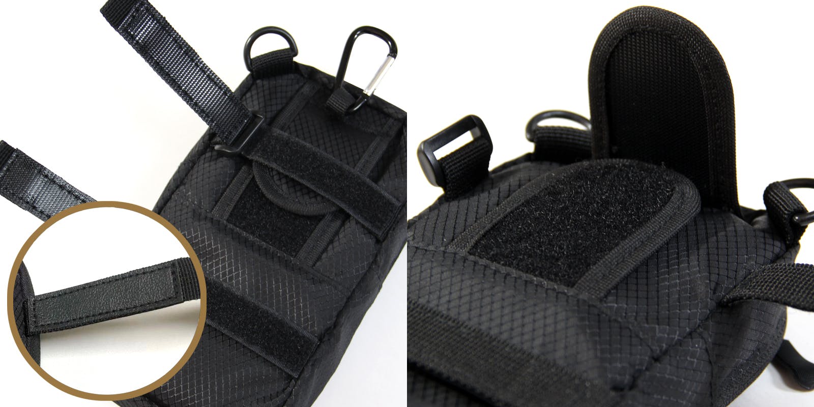 リュックのストラップに装着するマジックテープにはズレ落ち防止の滑り止め生地を縫い付けてあります。リュックのストラップ上部にループがあれば、付属のカラビナを掛けることで脱落防止になります。