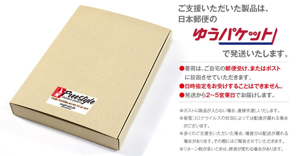 ◯ 商品引渡しまたは役務提供の時期:各プロジェクトが募集期間内に成立した場合のみ、支援金の決済が行われ、約定されたリターンを得る権利が発生します。なお、リターン毎の発送(履行)時期は各プロジェクトの記載・連絡に準じます。諸般の事情により遅延・遅配が生じる場合は、プロジェクトオーナーより記載・連絡されるものとします。