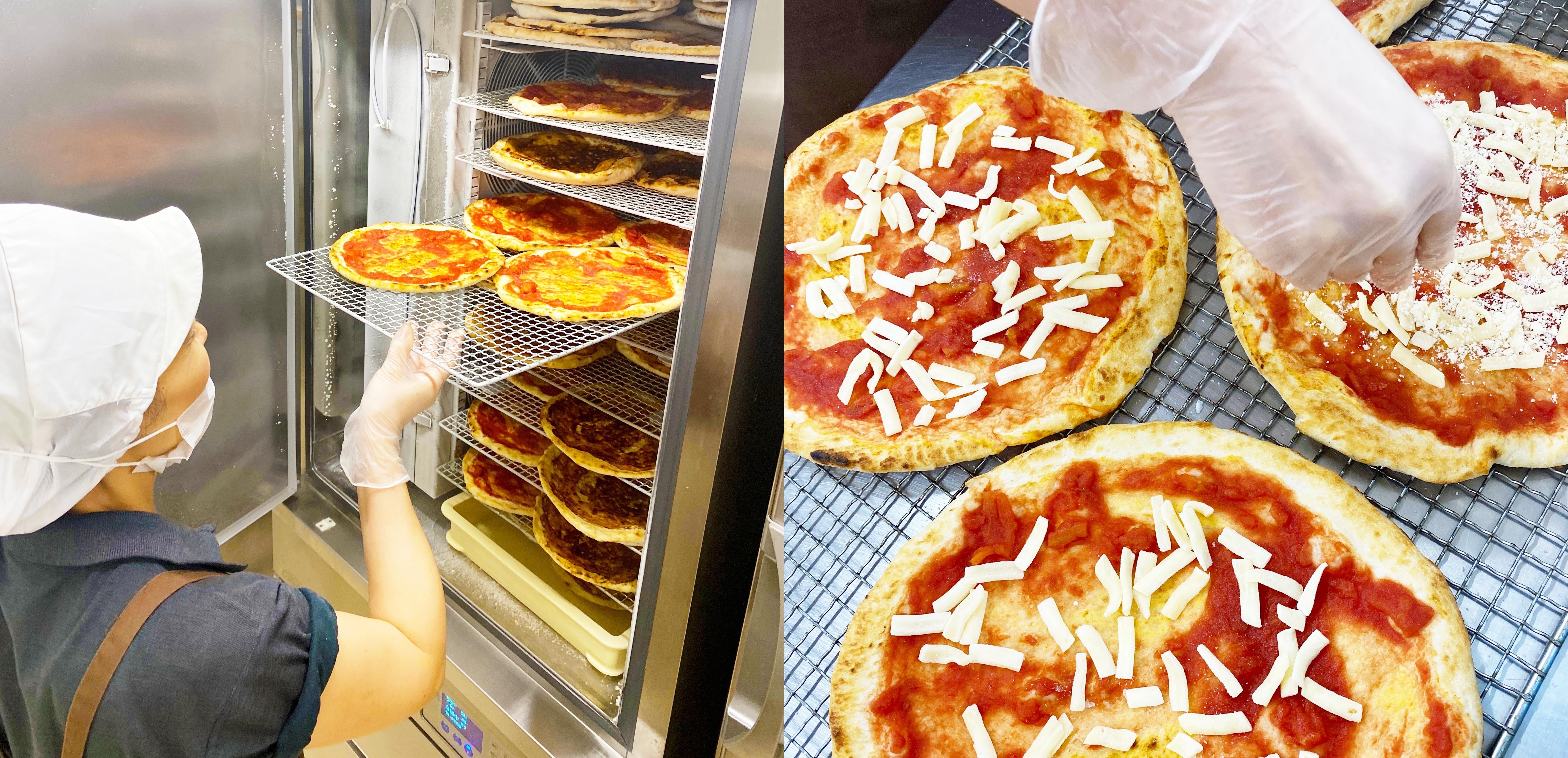 ▲ 石窯で焼き上げたミラノピッツアをブラストチラーに入れる作業。