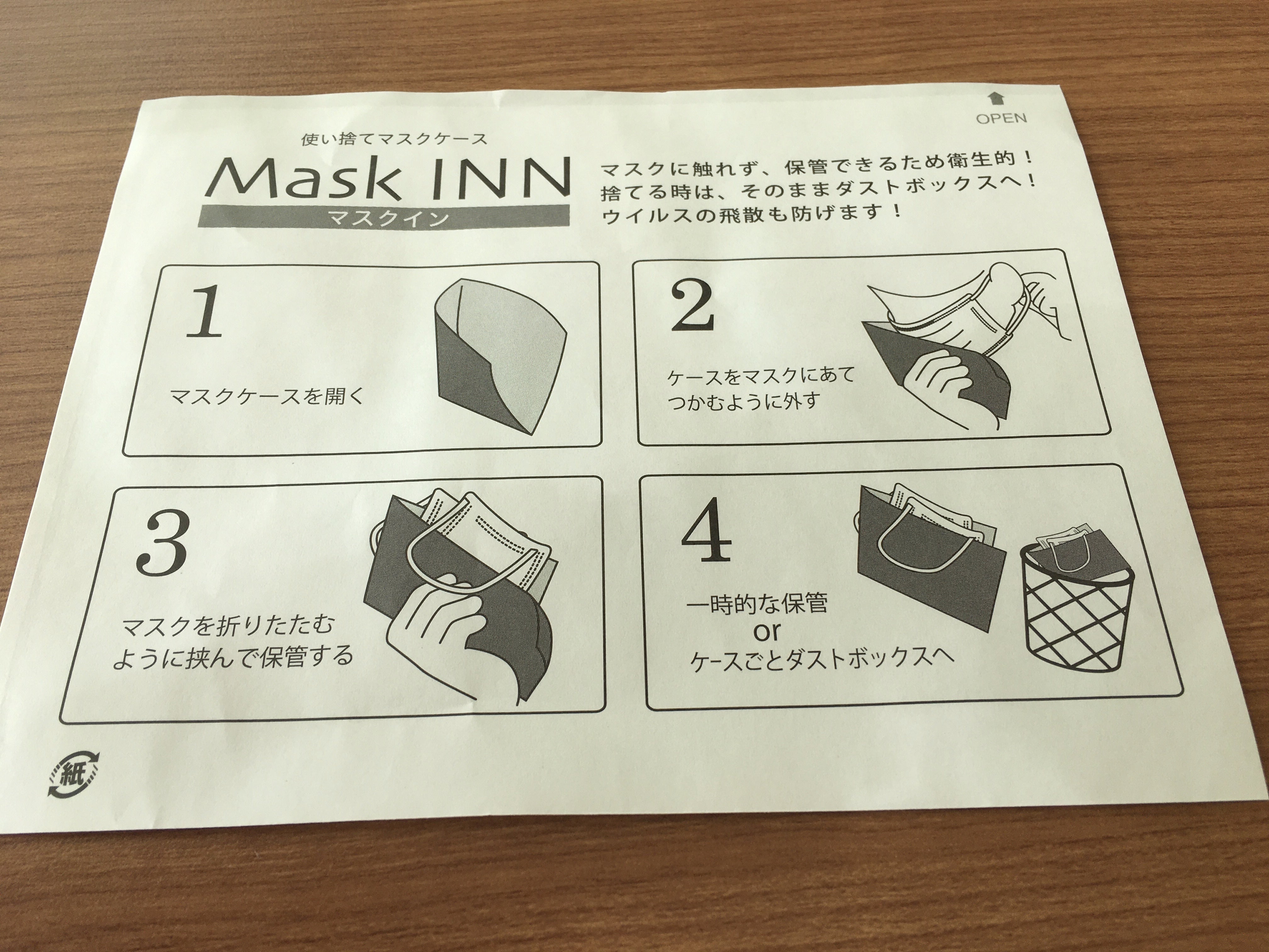 「では、こちらの使い捨てマスクをお使いください。また、テーブルに置かれる際には、ケースをお使いください。」