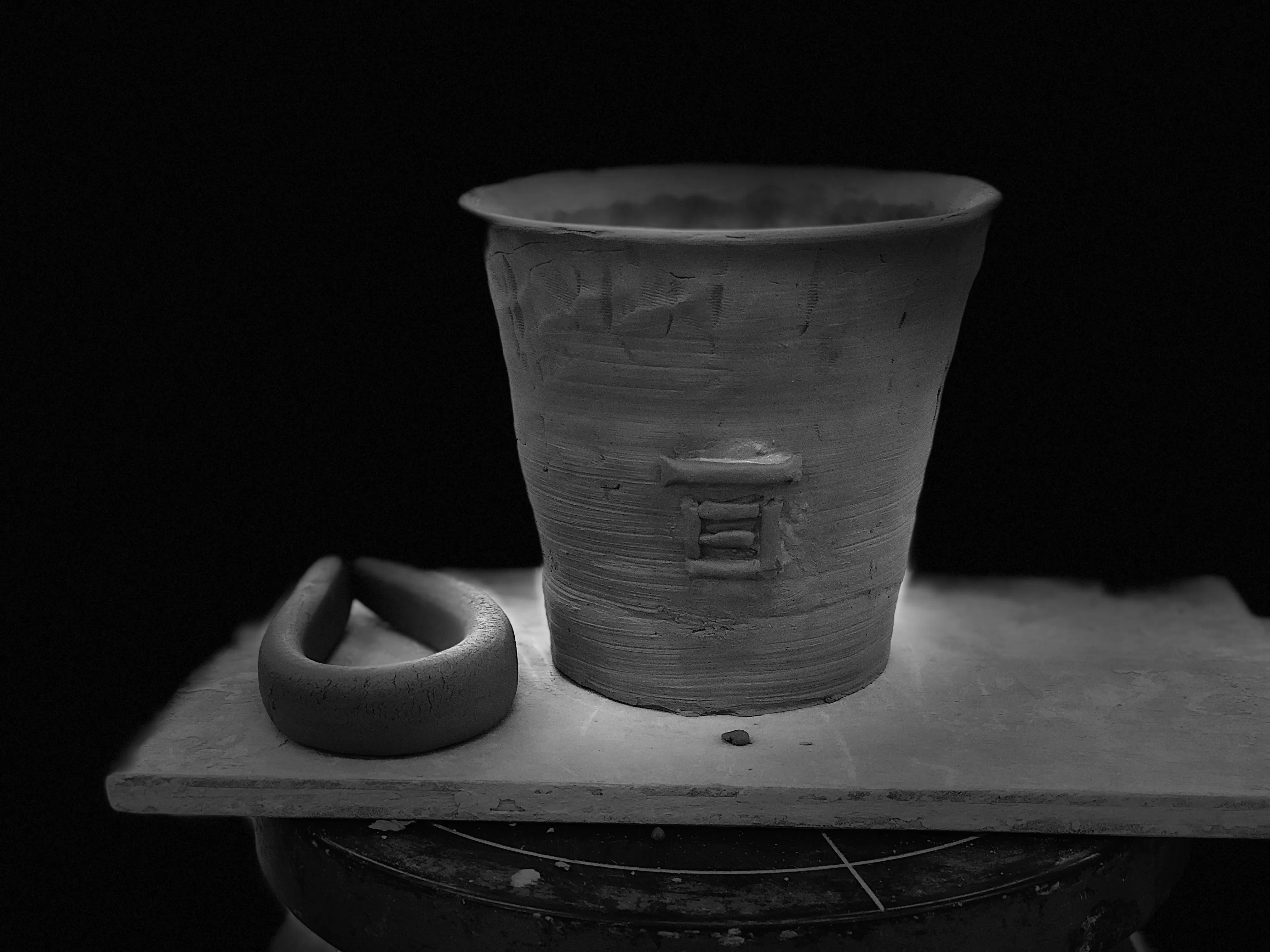 土は焼くと2割ほど小さくなるようで、このような大きさのフリーカップにするには右のように大きめのサイズで焼きます!名前やイニシャルを付けたほうが、コップを持ってもすべりにくくなるのようです。何を書こうか悩みます。
