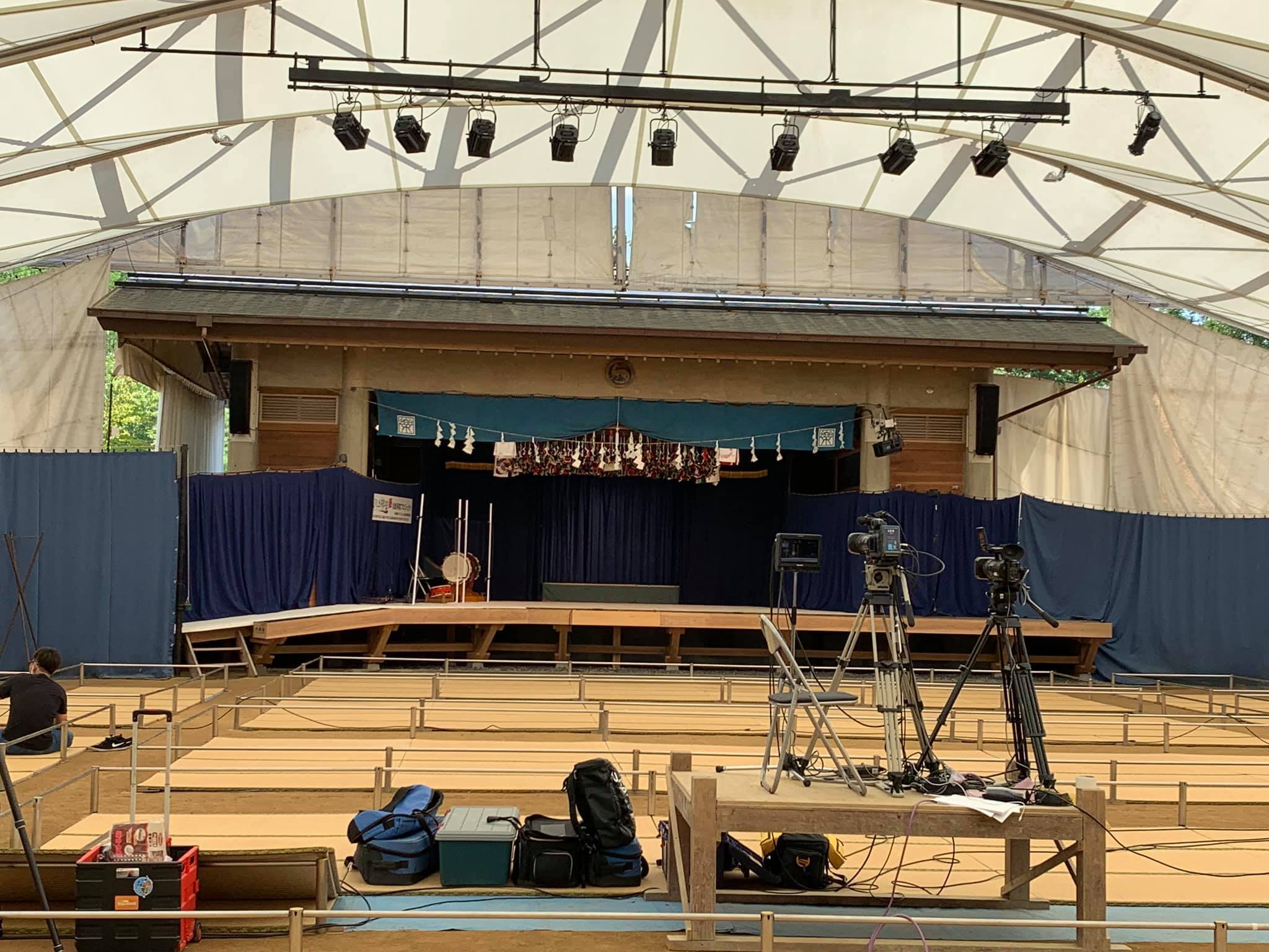 当施設内にある「神楽ドーム」は、2,000人収容できる神楽専用の劇場です。今回は、無観客公演なので、お客様は、いらっしゃいません(涙)その代わり、YouTubeで配信するためのプロ仕様のビデオカメラが、スタンバイしています。