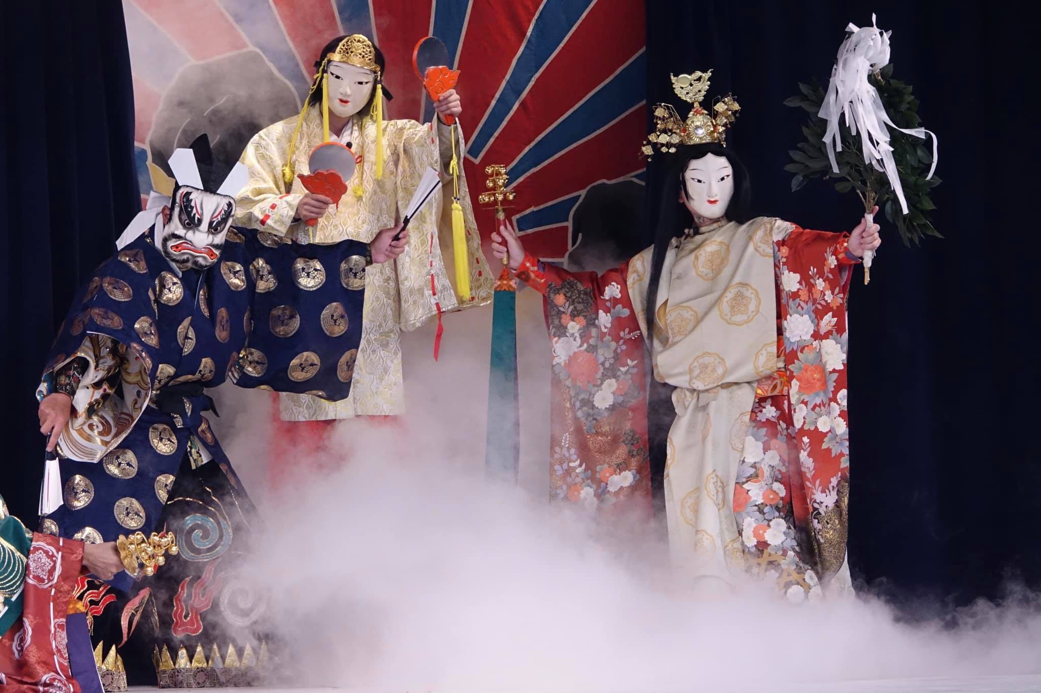 続いては、「桑田天使神楽団」による「岩戸」です。この演目は、天岩戸にお隠れになった天照大神を、歌と踊りで呼び戻す、という内容。今年は、新型コロナウイルス感染症の影響で大変な状況ですが、天岩戸が開くように、明るい兆しが見えてくるといいですね。