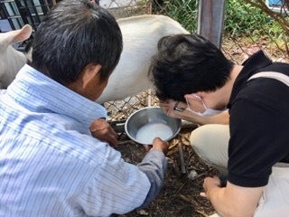早速,山羊の乳しぼり体験にトライ。