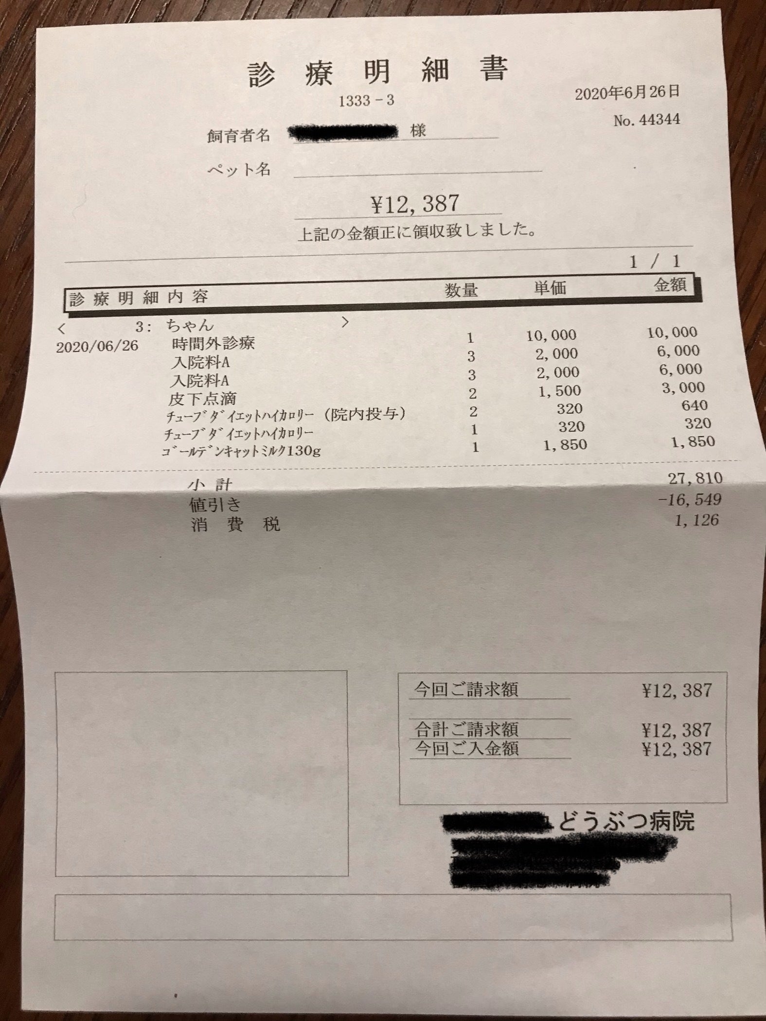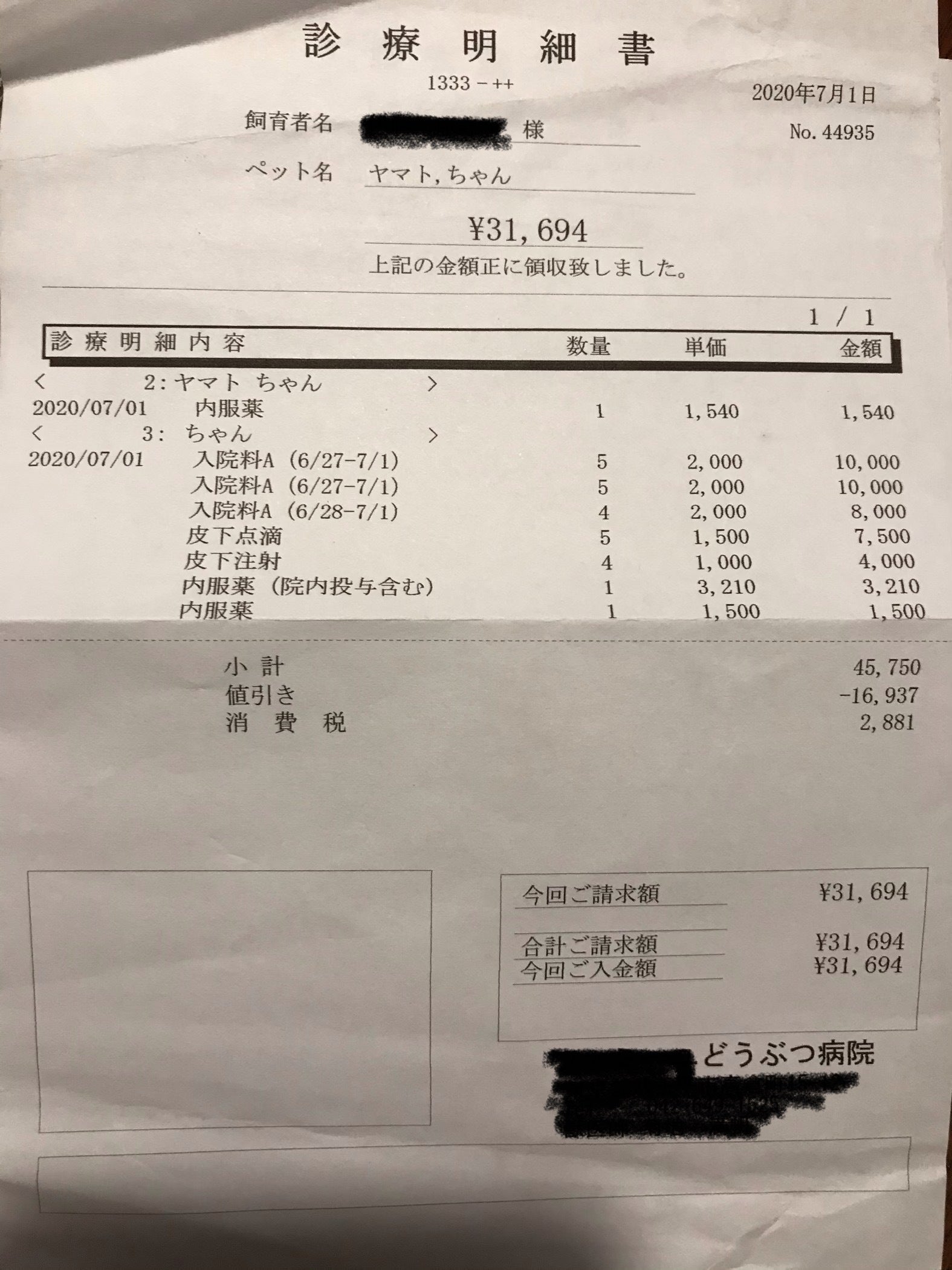 2021/08/25 01:56一つ前の投稿から続けて失礼致します。昨日、一年ぶりのワクチン接種に行ってきました!!病院へ行くのも、去年の避妊去勢手術以来でした。本当にありがたい事です。1年前は3匹で入れた大型ケージも、今では2匹ずつでやっと入れるくらいに。(運ぶ関係でケージが1匹ずつ用意できませんでした。ごめんね)1年前と同じく、先住猫のヤマトも一緒に4匹まとめての接種となりました。久しぶりの車。緊張とストレスでみんな口が開いてしまったり鳴きっぱなしでしたが病院に着いてからは一切泣かず暴れず全員とても大人しく接種することが出来ました。お世話になっている動物病院が素晴らしいのはもちろん、3匹ともここまで落ち着きのある子に育ったことが本当に有難くすごい!えらい!頑張ったね!とたくさん褒めました。ロクは5kgナナは3.8kgハチは4.95kgと、体重もすごく成長していました。つい比べてしまいナナは女の子だし小柄だなぁ、軽いなぁといつも思っていたのですが、これが普通サイズで男子たちが長い(大きい)!と言われました(笑)全員が繰り返し入院し、何匹残るかな、と不安だった当初からは想像もつかないくらいみんな本当に毎日元気に大きくなりました。ここまですくすく育ったのも、病院の先生方と皆様からのご支援のおかげです。感謝してもしきれません。本当にありがとうございます。(保護した張本人の息子も、夏休み毎日朝からお世話を頑張ってくれています。ありがとう。)ここからはワクチン接種の金額報告です。まずこちらが接種証明です。こちらが領収書になります。診察料が1匹200円ワクチン代が1匹4500円の計算です。前回同様、先住猫のヤマトが同じ領収書になってしまっておりわかりづらく申し訳ありません。ヤマトの医療費については、今までもこれからもご支援金は一切使っておりませんのでご容赦ください。その為昨日はヤマトの費用4700円を引いた15980円をご支援金から頂きました。本当にありがとうございます。一つ前投稿のナナの避妊手術費34980円+今回の3匹ワクチン費15980円を収支報告から引かせて頂き、皆様からのご支援金残高は10115円となりました。(説明が下手ですみません…不明瞭でしたらメッセージ頂けたらまとめ直しますのでよろしくお願い申し上げます。)残りのご支援金も、医療費のみに大切に大切に使わせて頂く所存です。皆様のおかげで本当に元気でいてくれているので活動報告はまた長く期間が空いてしまうかと思いますが、Twitterでの報告は少しずつですが頑張りますので今後ともよろしくお願い申し上げます。いつもご支援、励ましのお言葉本当に本当にありがとうございます。このようなご時世ですが、皆様の健康を祈っております。 もっと見るナナの避妊手術について