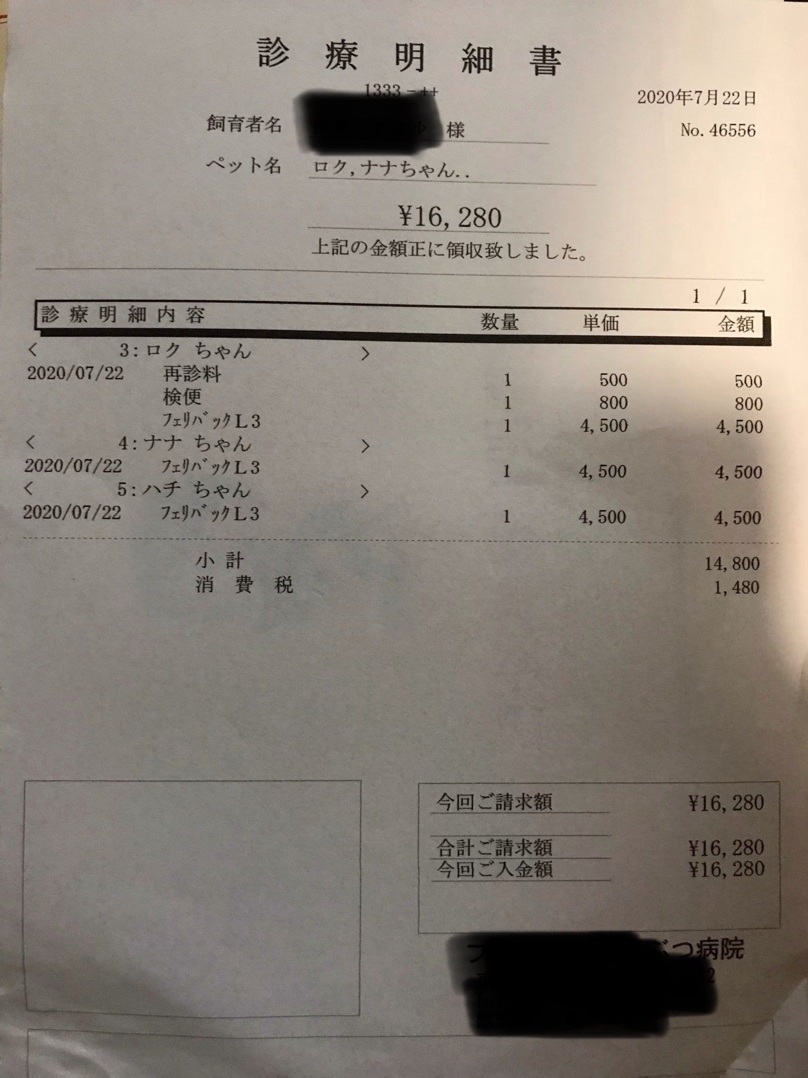 ワクチン前に検便があったのですが、全員朝から快便の為一匹しか取れませんでした。
