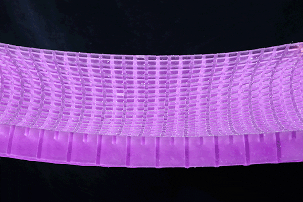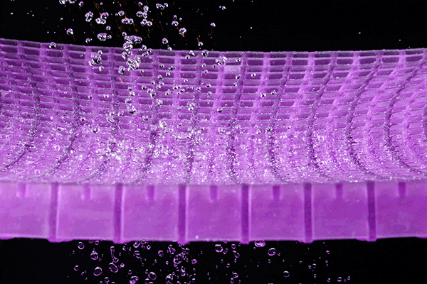 「水の浮力」をコンセプトに生まれた、多層一体成型の立体格子型グミ状ジェルが「GELTRON(ジェルトロン)」です。もともとは宇宙船内用衝撃緩衝材の研究開発の過程から生み出されました。グミキャンディーのような肌に優しい感触で、体圧分散性、ずれ・ねじれの吸収性、通気性、耐久性、衛生特性に優れているため、一般家庭用マットレスから介護用マットレス、まくら、クッションなど多岐にわたる分野で使用されています。