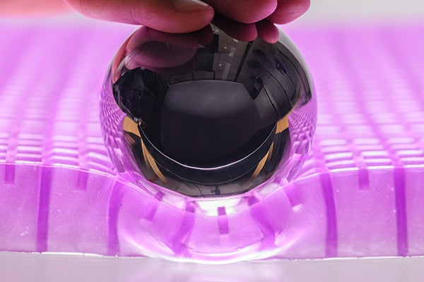 ジェルトロンは体の凹凸に合わせて柔軟に形状を変化させることで局部的な圧迫を減らします。平らな部分は沈み込みを抑え、骨などが突出した部分は深く沈み込みます。ジェルトロンが体との隙間を減らし、優しく支えることで体圧を分散します。