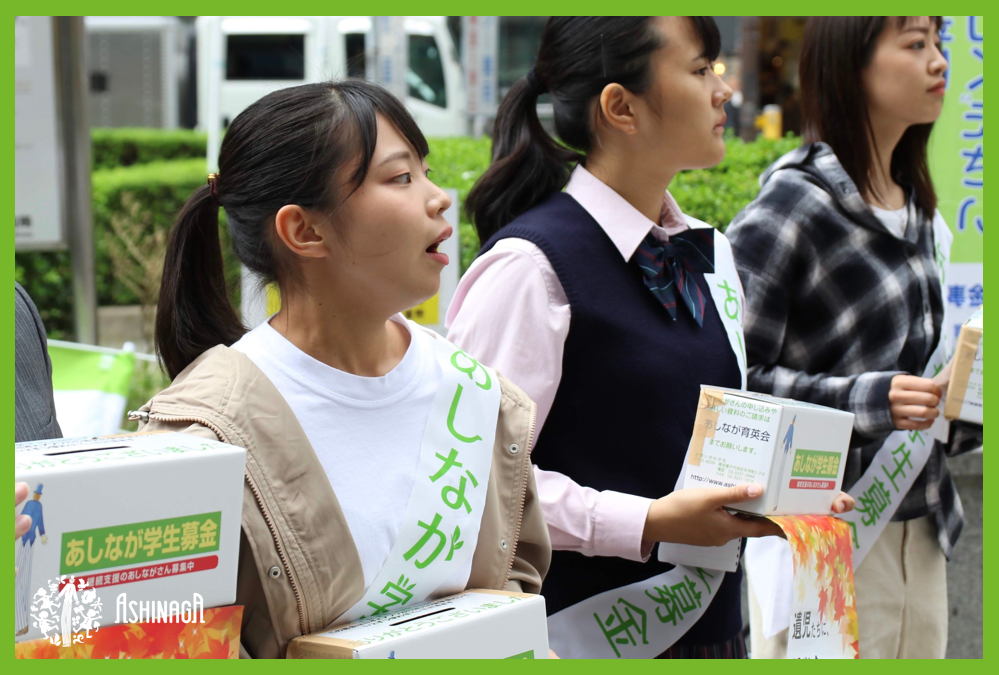 50年の歴史を持つ遺児支援のための募金運動団体で、学生だけで運営されています。毎年春と秋の4日間、全国約200か所で実施している街頭募金活動では、毎回のべ1万人のボランティアスタッフの参加があり、年間約2億5千万円の寄付を募っています。募金はすべて一般財団法人あしなが育英会へ寄付し、あしなが育英会の奨学金事業(国内奨学生事業・AAI事業)のために使われています。