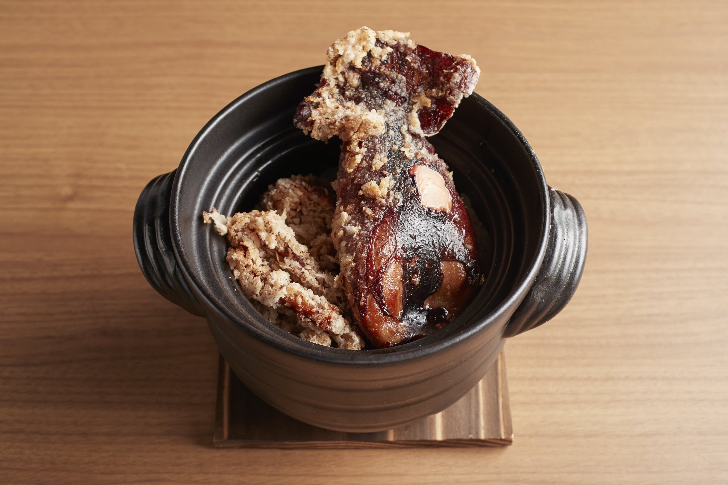 通常お店では、イカを油で揚げてから土鍋ご飯に乗せて、ハサミで切り分けてから食べます。