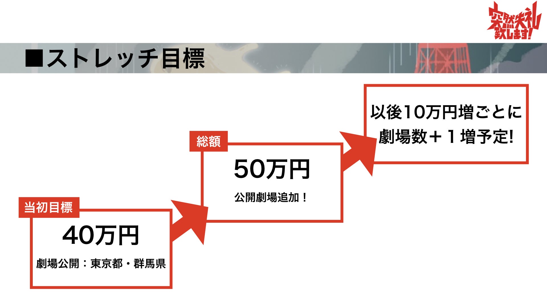 また、目標金額を達成した上で、更に多くの方々に観ていただきたいと考え、下記の通りストレッチゴールを新たに設定いたしました。