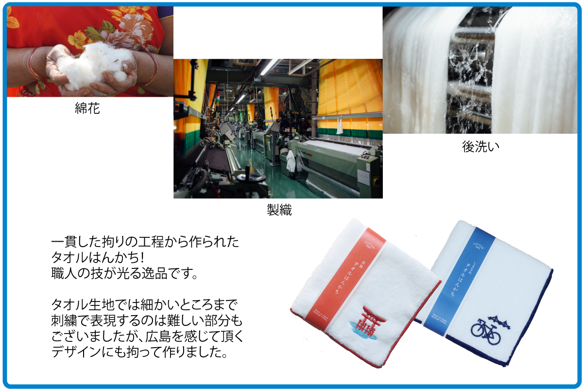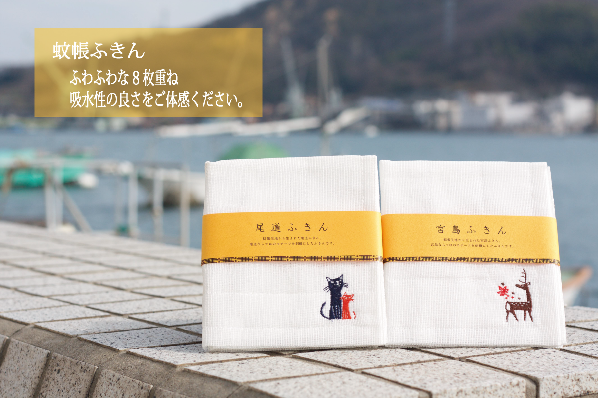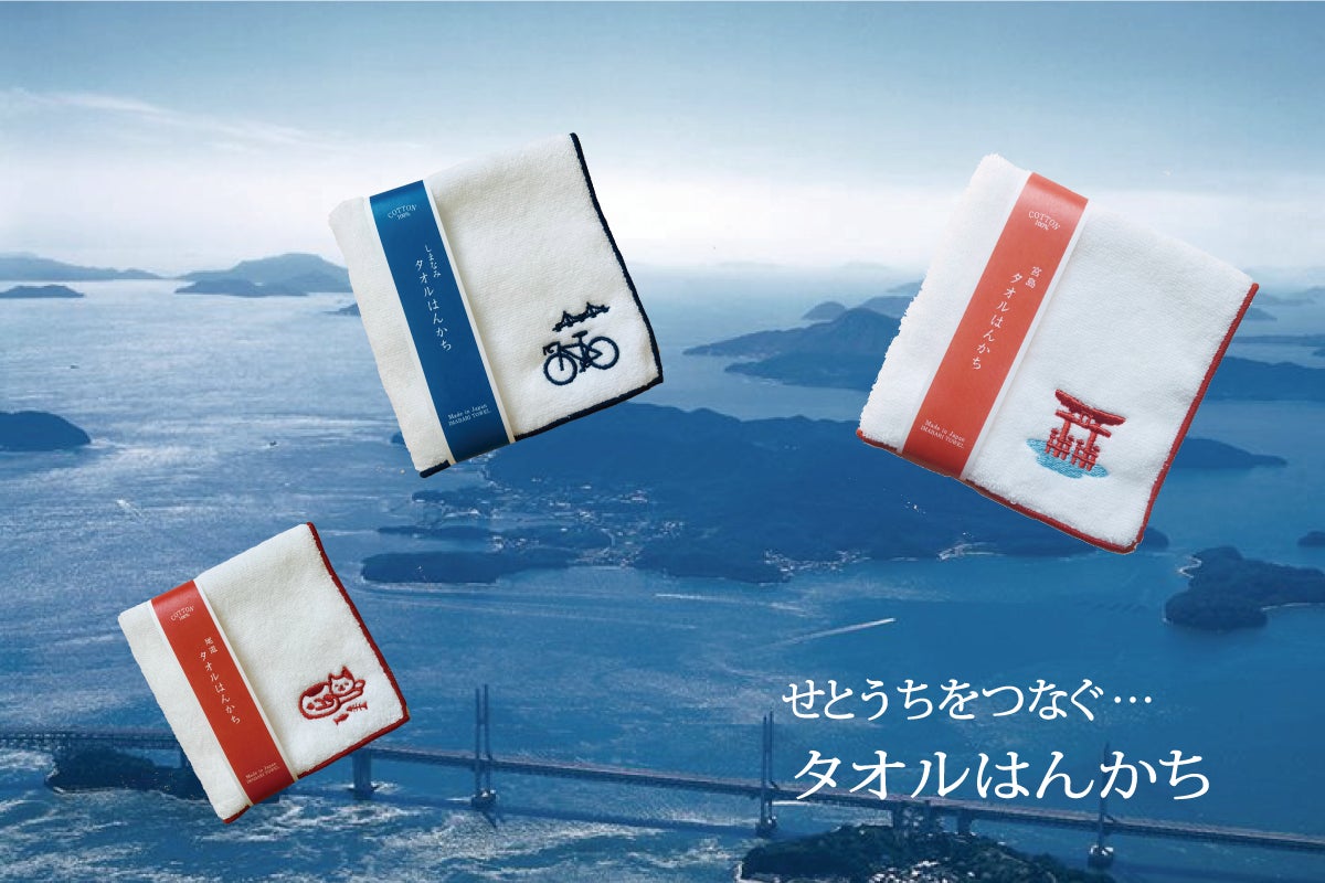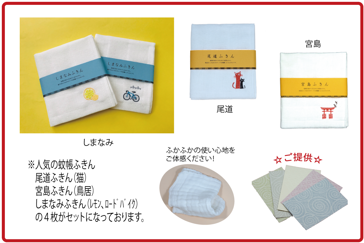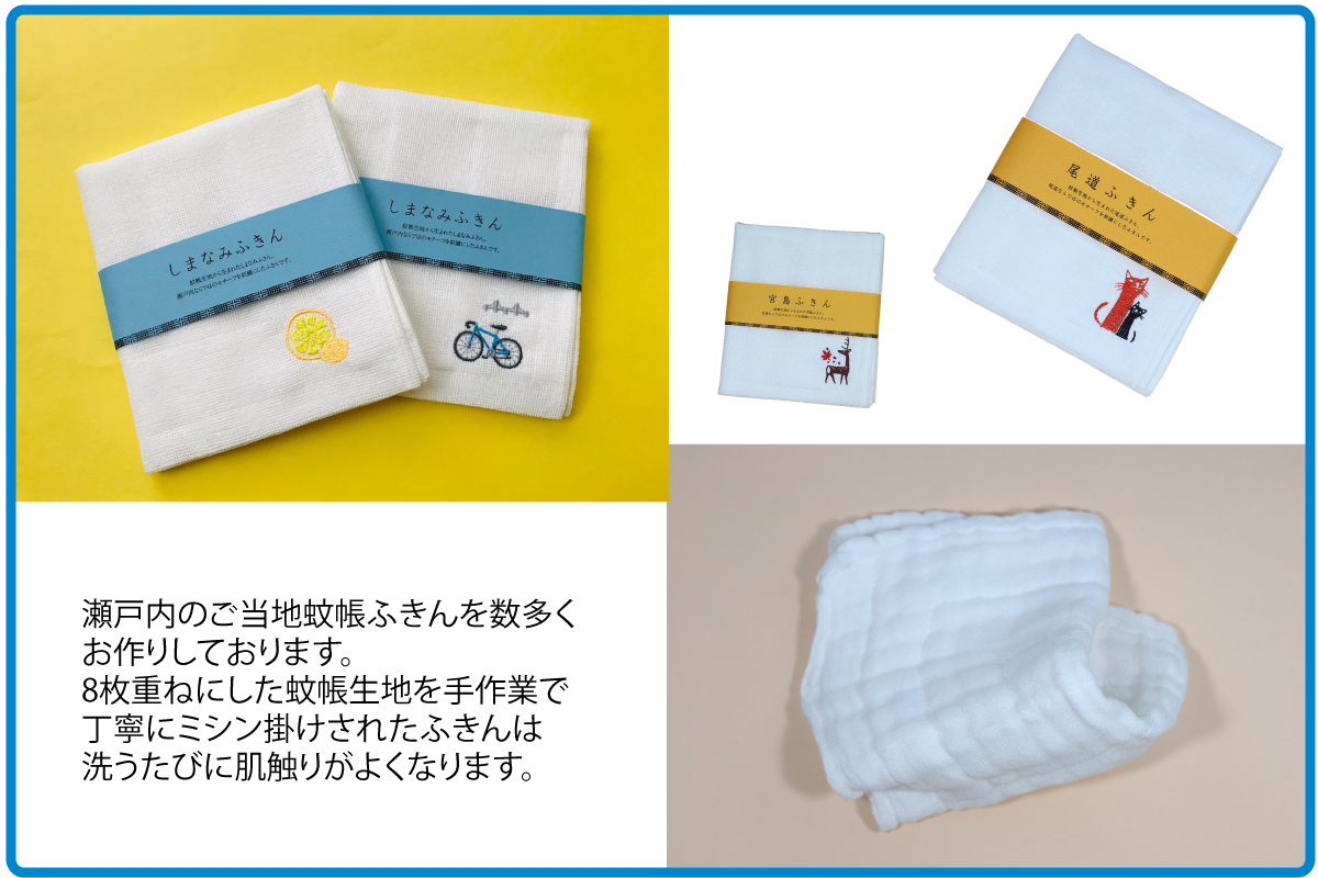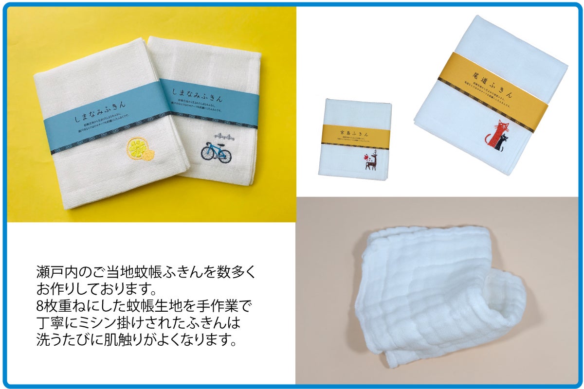 しまなみ海道で繋がる対岸の今治市の特産、今治タオルの老舗企業とのコラボ商品や人気の蚊帳ふきんを是非ともご体感頂ければ幸いです。