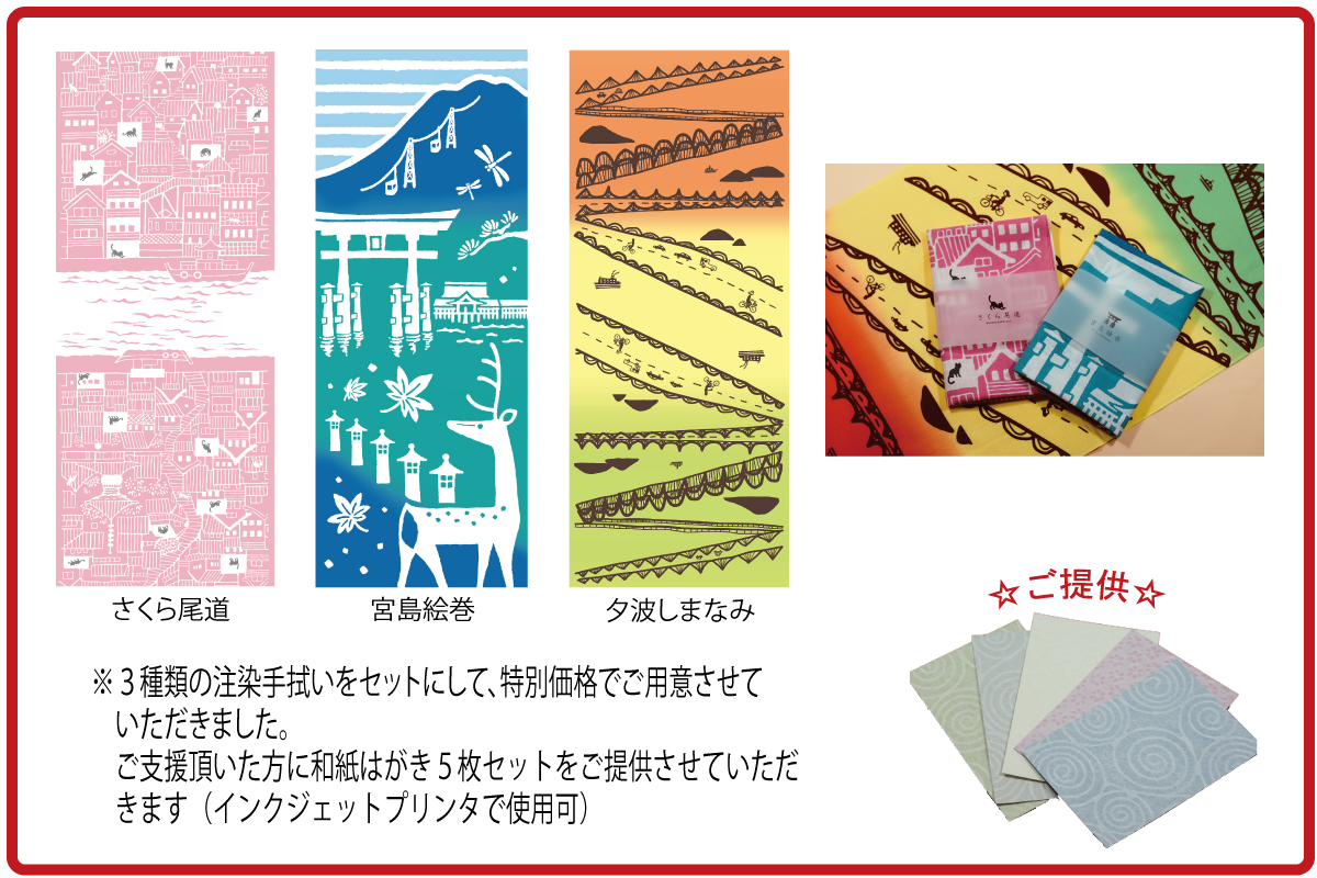 注染手拭い…さくら尾道 詳細、宮島絵巻 詳細、夕波しまなみ 詳細