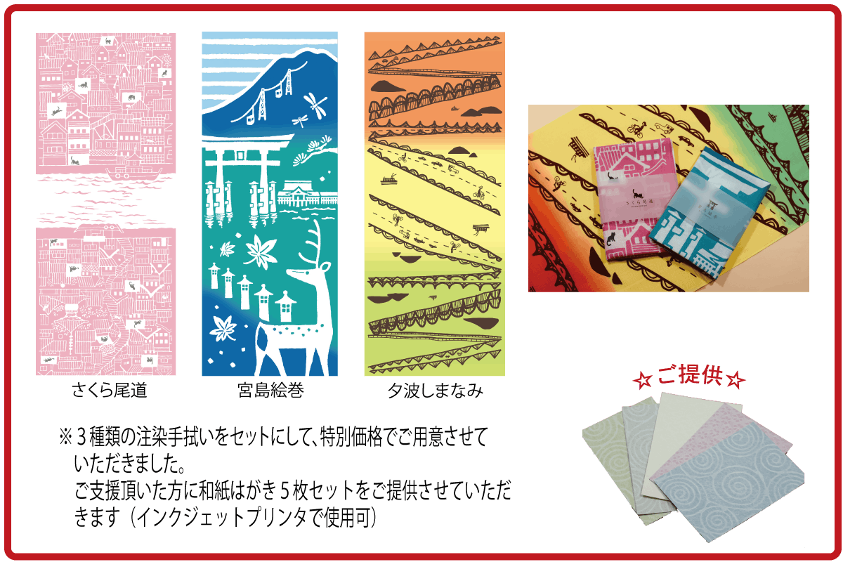 注染手拭い…さくら尾道 詳細、宮島絵巻 詳細、夕波しまなみ 詳細