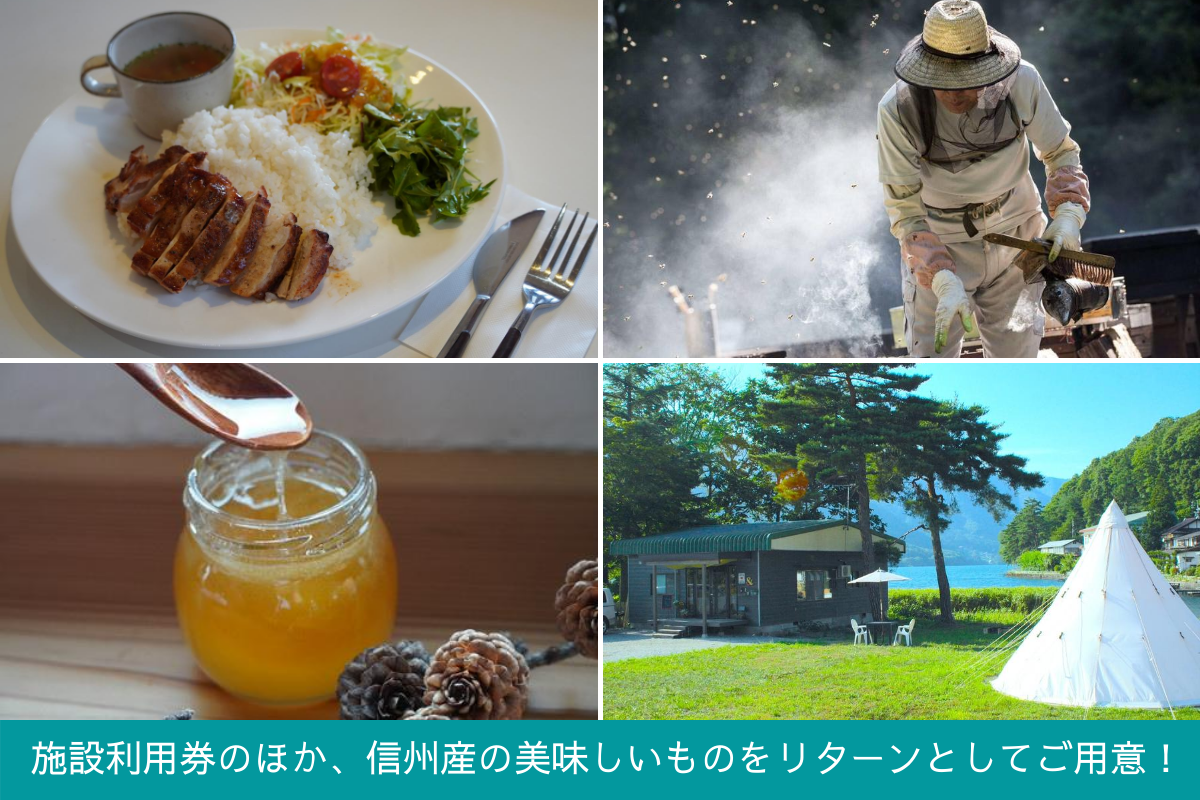 リノベーション後の施設がお得に利用できる施設利用券の他、木崎湖周辺のカフェや、温泉施設の利用券、信州産の美味しいもの…などなど。いずれも木崎湖畔らしいリターン品をご用意しました。