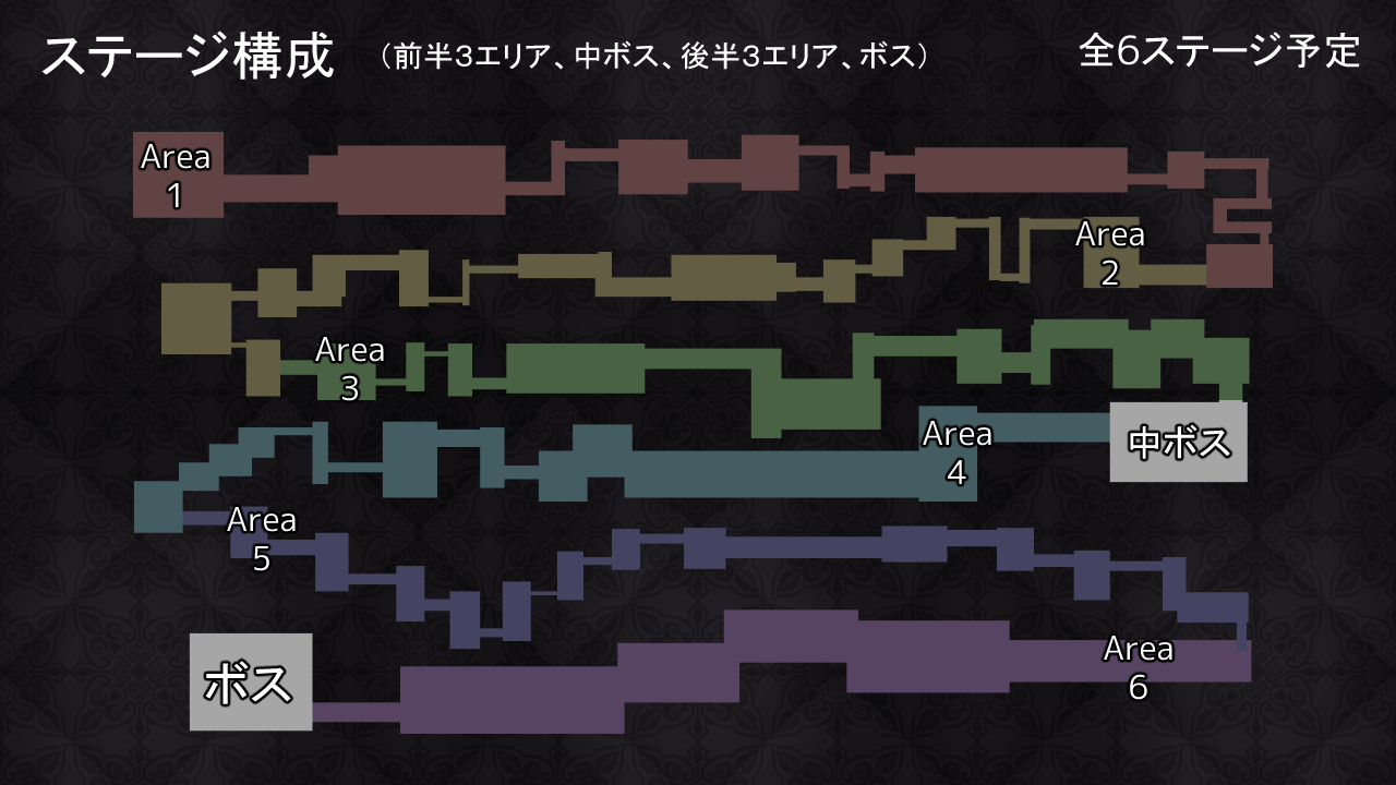 ゲームはステージ制で進行します。コース最奥のボスを倒せばステージクリアとなります。全6ステージを予定しています。