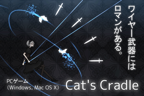 ご存じの通り、漫画やアニメ等において、ワイヤー使いやメイドはしばしば強キャラとして描かれます。「Cat’s Cradle」は、その二つの強キャラ成分を掛け合わせたPC用の2Dアクションゲームになります。つまり、メイドさんがワイヤーで空中を飛び回りながら敵を切断していく作品です。WindowsとMacでのリリースを予定しています。