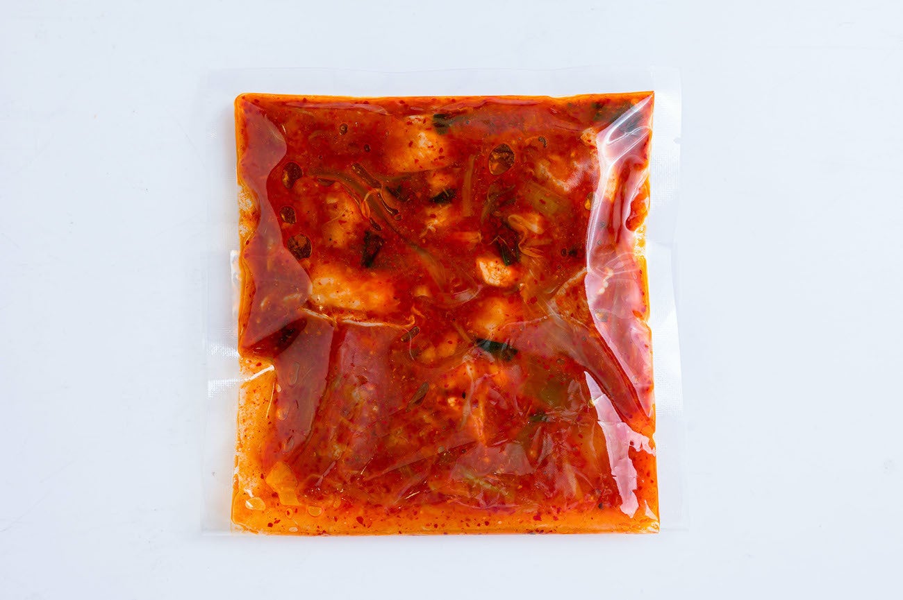 タッカルビは、韓国の春川(チュンチョン)という地域の郷土料理で、鶏肉をサツマイモやキャベツ玉ねぎなどの野菜と一緒にピリ辛のタレで炒めた料理です。最後にチーズをトッピングした「チーズタッカルビ」が日本でも人気となりましたが、松山カルビでは今でも人気の高い看板料理となっています。その松山カルビのタッカルビを1人前ずつパッケージしてありますので、湯煎あるいはレンジアップして手軽にお召し上がりいただけます。