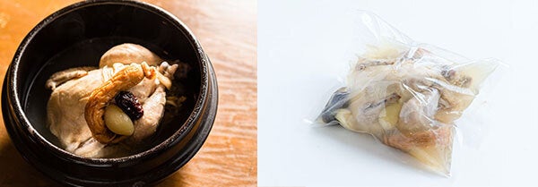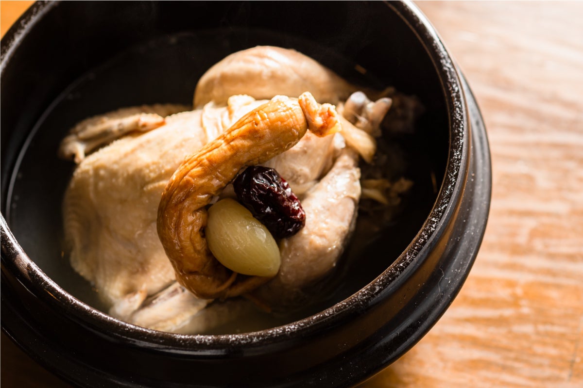 サムゲタンは創業の頃より私が作ってきた名物料理のひとつです。今回は4年物の質のいい高麗人参を入れて塩のみの味付けで作っています。小さな若鶏から染み出るエキスと高麗人参やニンニク、ナツメ、もち米などの栄養分が凝縮された、美味しくて身体に嬉しい栄養がたっぷりの薬膳料理です。