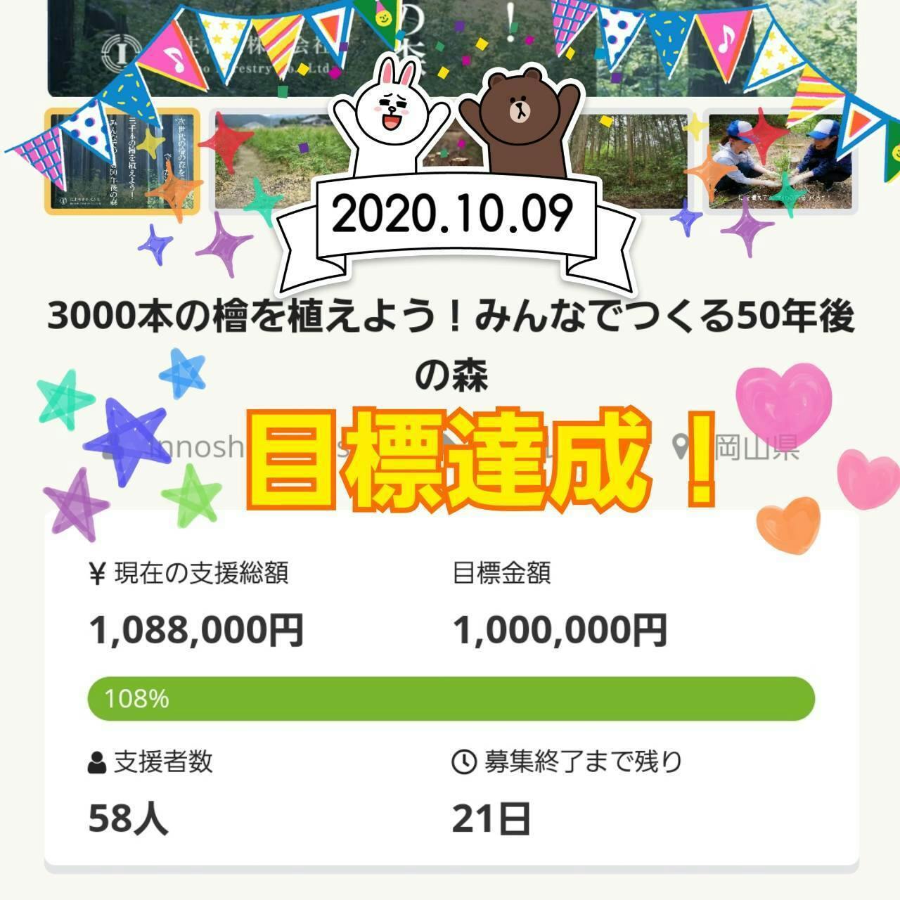 皆様にたくさんのご支援を頂き10/9 に目標金額の100 万円を達成いたしました。