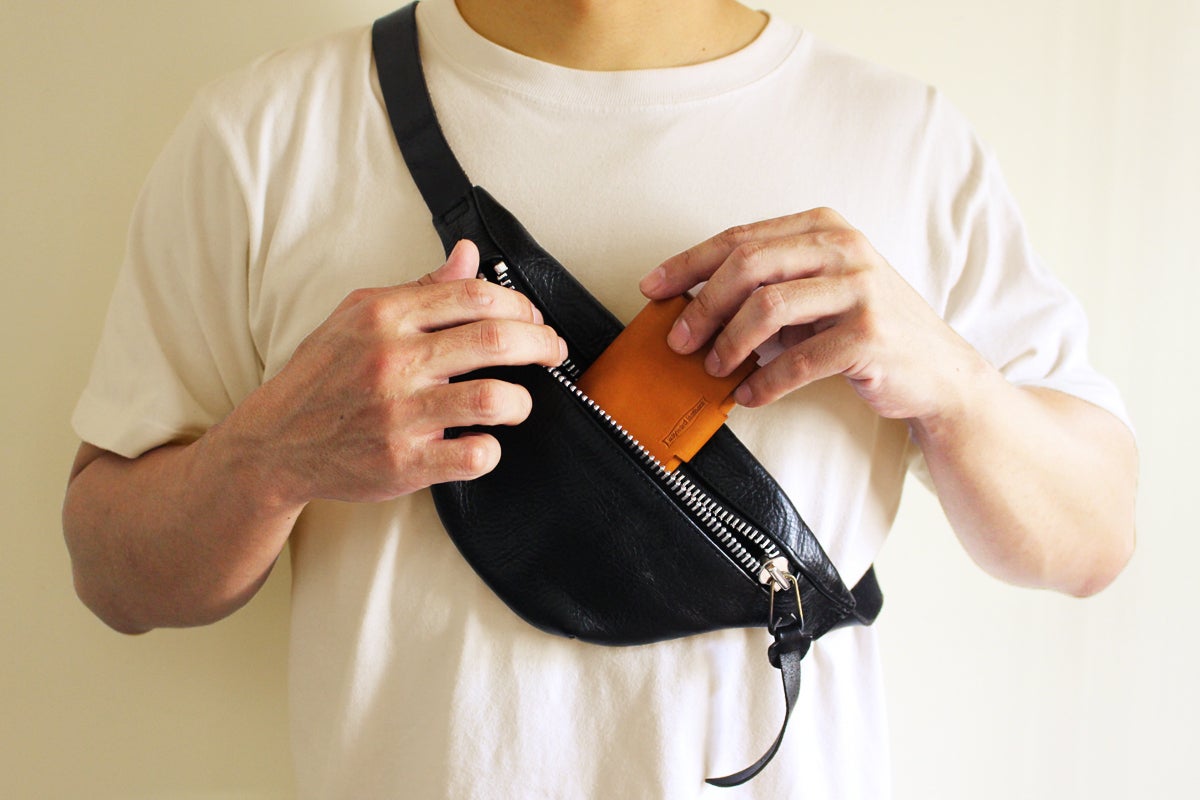 ほつれの心配もない。1stモデル同様、金具は使わずに革だけで。