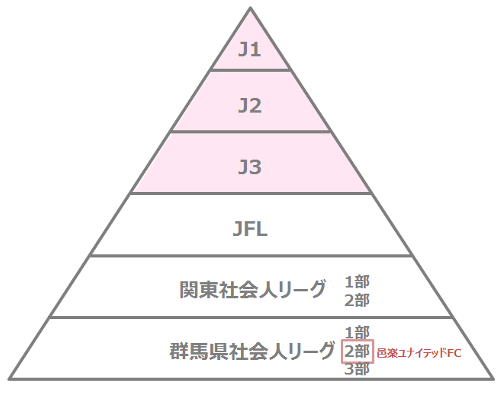 ※群馬県2部リーグの上は1部リーグ、その上は関東2部リーグ、1部リーグ、JFL、J3というカテゴリー構造となっています。