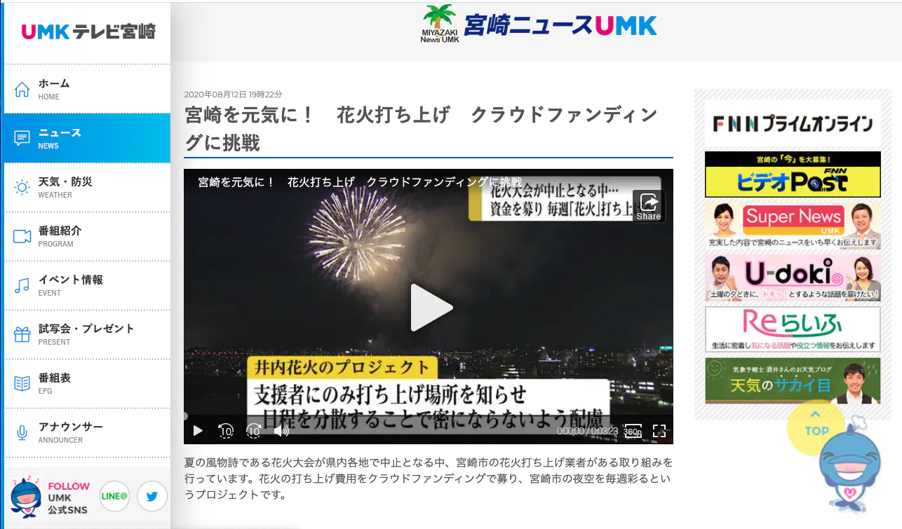 昨日夕方のテレビ宮崎のニュース中で今回のクラウドファンディングでの取り組みを取り上げて頂きました。なんと3分半程度の長さもとっていただき、大変うれしく思っております。