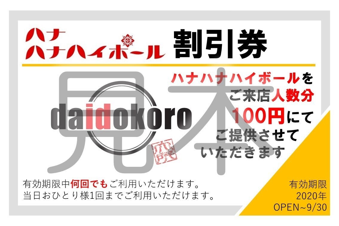 ご来店ごとにお店スタッフに指定Facebookコメント、Twitterツイートのシェア画面をお見せください。「ハナハナハイボール」を100円にてご提供させていただきます。