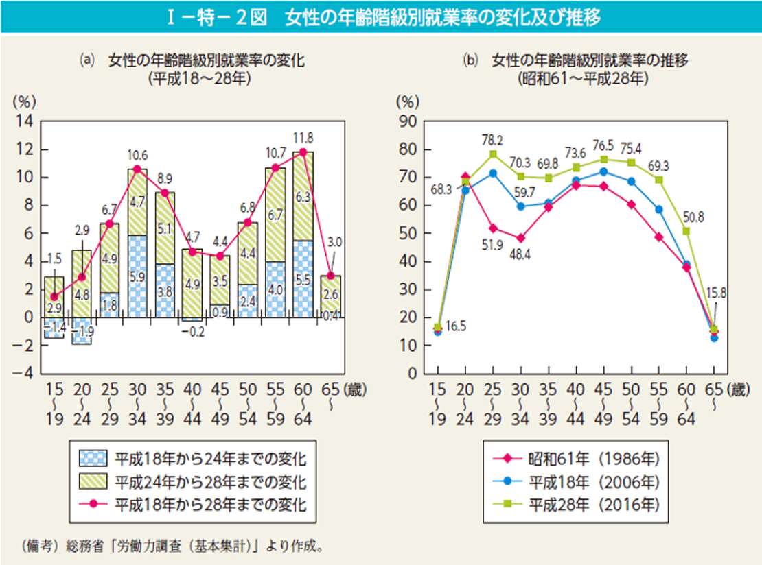 I-特-2図 女性の年齢階級別就業率の変化及び推移