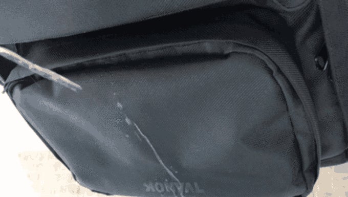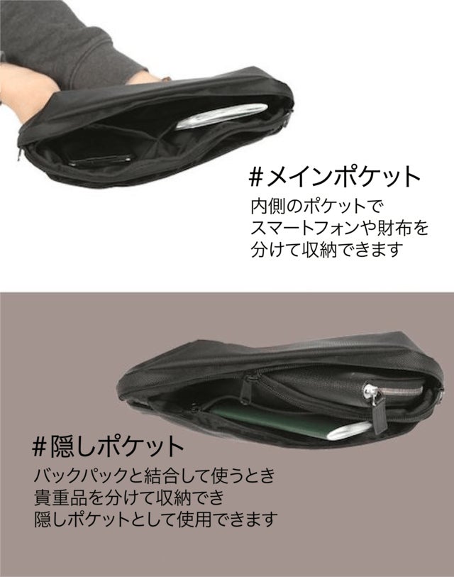 クロスバッグはベルトなどで装着するのではなく、フックを使ってバックパックに直接結合します。