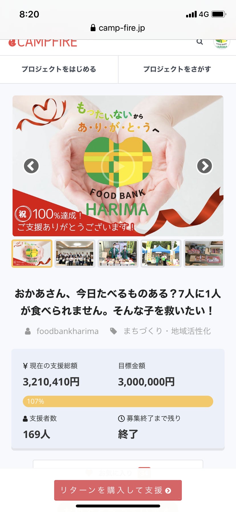 8月6日から始まったフードバンクはりまのプロジェクトは、無事に目標金額達成し終了いたしました(^^)